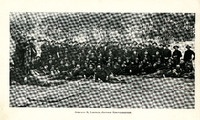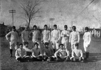 Caption reads "UNIVERSITY OF NEBRASKA FOOTBALL 1890 THE FIRST FOOTBALL TEAM. BACK ROW: Skiles, Mockett (Capt.), Chandler, Hyde, Anderson, Stroman, Porterfield, Troyer Mgr) [sic]. FRONT ROW: Girard, Dr. Frothingham (Coach), Lord, Morrow, Stockton, Johnston.