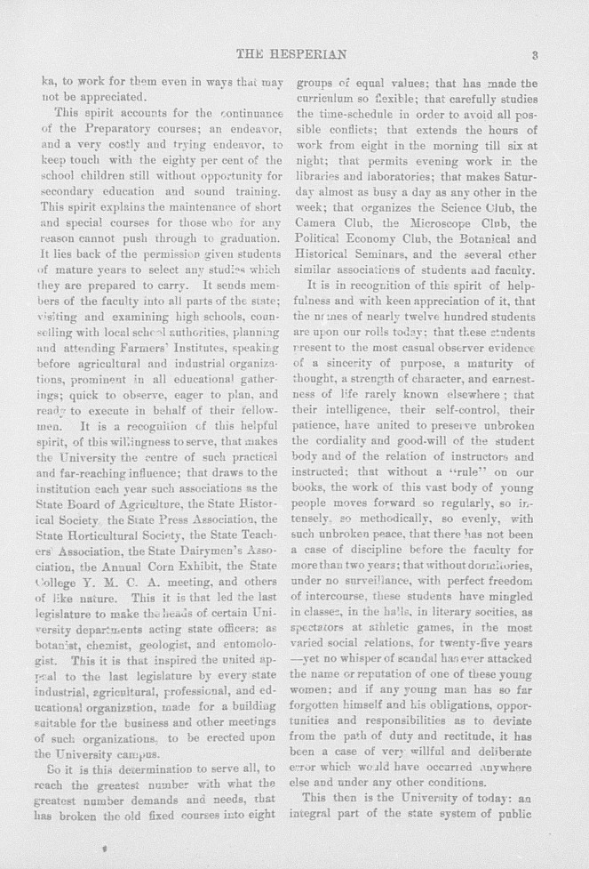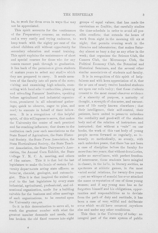 This spirit accounts for the continuance of the Preparatory courses; an endeavor, and a very costly and trying endeavor, to keep touch with the eighty per cent of the school children still without opportunity for secondary education and sound training. This spirit explains the maintenance of short and special courses for those who for any reason cannot push through to graduation. It lies back of the permission given students of mature years to select and studies which they are prepared to carry. It sends members of the faculty ito all parts of the state; visiting and examining high schools, counseling with local school authorities, planning and attending Farmers’ Institutes, speaking before agricultural and industrial organizations, prominent in all educational gatherings; quick to observe, eager to plan, and ready to execute in behalf of their fellowmen. It is a recognition of this helpful spirit, of this willingness to serve, that makes the University the centre [sic] of such practical and far-reaching influence; that draws to the institution each year such associations as the State Board of Agriculture, the State Historical Society, the State Press Association, the State Horticultural Society, the State Teachers Association, the State Dairymen’s Association, the Annual Corn Exhibit, the State College Y.M.C.A. meeting, and others of like nature. This it is that led the last legislature to make the heads of certain University departments acting state officers: as botanist, chemist, geologist, and entomologist. This it is that inspired the united appeal to the last legislature by every state industrial, agricultural, professional, and educational organization made for a building suitable for the business and other meetings of such organizations, to be erected upon the University campus.
