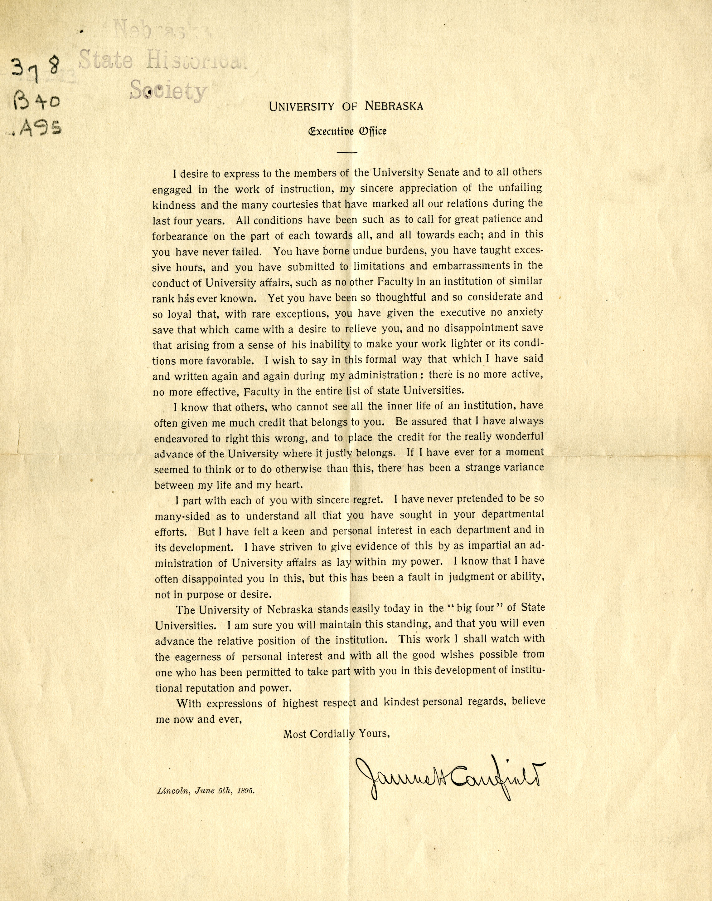 The University of Nebraska stands easily today in the "big four" of State Universities. I am sure you will maintain this standing, and that you will even advance the relative position of the institution. This work I shall watch with the eagerness of personal interest and with all the good wishes possible from one who has been permitted to take part with you in the development of institutional reputation and power.