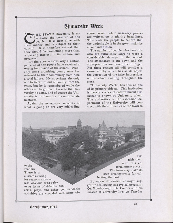 In order to be completely open to the public, and to try and prove the criticisms wrong, the 1914 Cornhusker also proposed a one-week showcase of the university's talents called "University Week." It would include performances by the band, debate team, glee club, and drama club that would bring popularity and public favor back to the university (1914).