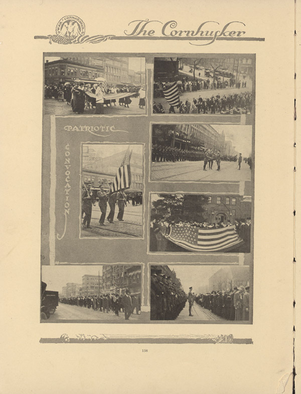 Photographs of the 1917 parade and convocation held by the University of Nebraska and published in the Cornhusker Annual. The parade illustrated the support of the United States after entering World War I. The University of Nebraska held a parade followed by an All-University Mass that featured cadets, faculty members, the chancellor, and the governor as speakers.