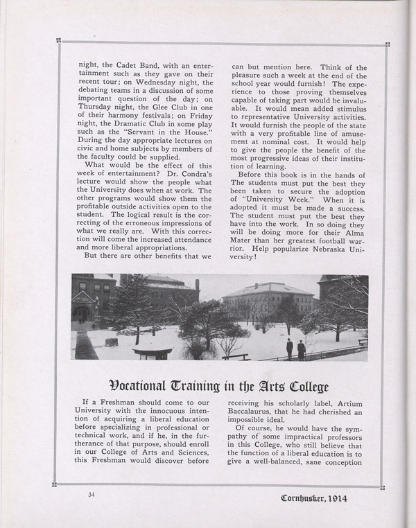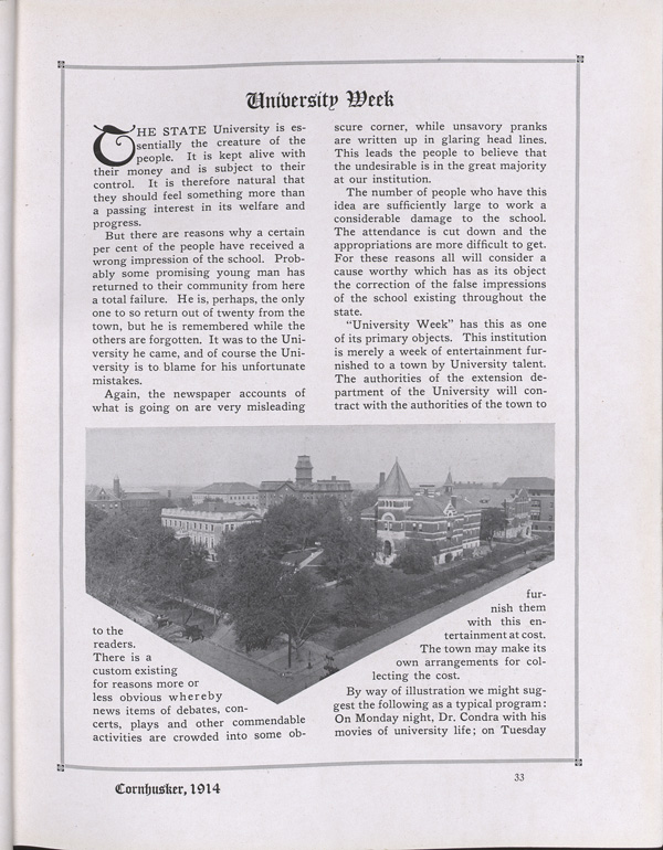 In order to show off the university's talents to a disheartened state, UNL proposed a one week "University Week" to display a wide variety of talents that had been accumulated by students at the university.