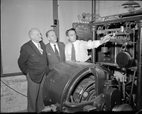 Lester Larsen showing the Tractor Test Lab's dynamometer to Joochin Pohl and August Hassle
