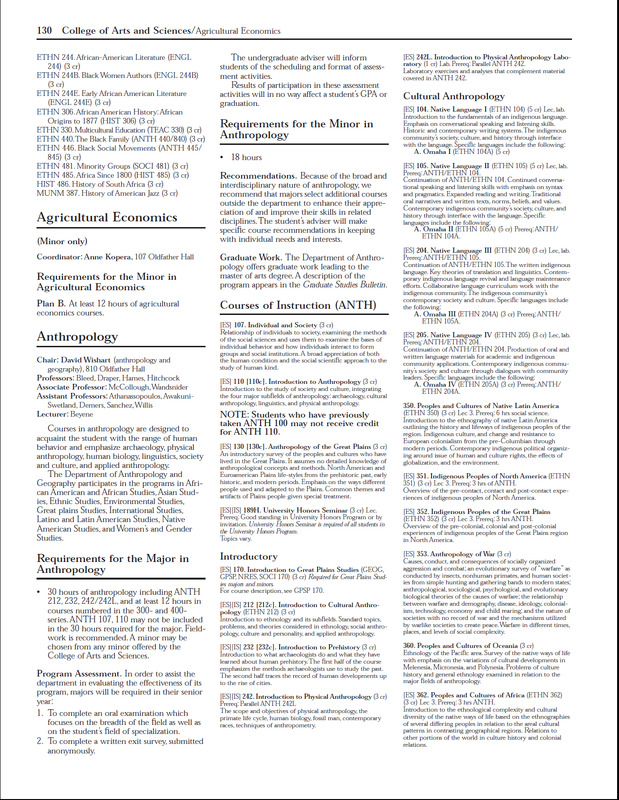 Today the course options at the University are quite different from the ones when the department was first founded. The department has gone from its modest beginnings with thirteen courses to over 70 in the 2006-2007 year. Not only has the number of courses increased by the variety has sky rocked. Where there was once a focus on Native American people there is now courses that looks at individual groups like the Omaha people. The old course of anthropology of Asia, Africa, and Europe has been replaced with two or three courses about each area alone. The current courses also reflect the increase and variation of anthropological thought in recent years. The changes in Anthropology have been shown in the course changes to include things like Medical Anthropology, Biological Anthropology, Anthropology of Women and Men, Anthropology of Art, and Archaeology. There is no doubt that as the department continues to grow as will the courses to reflect the change in the disipline.