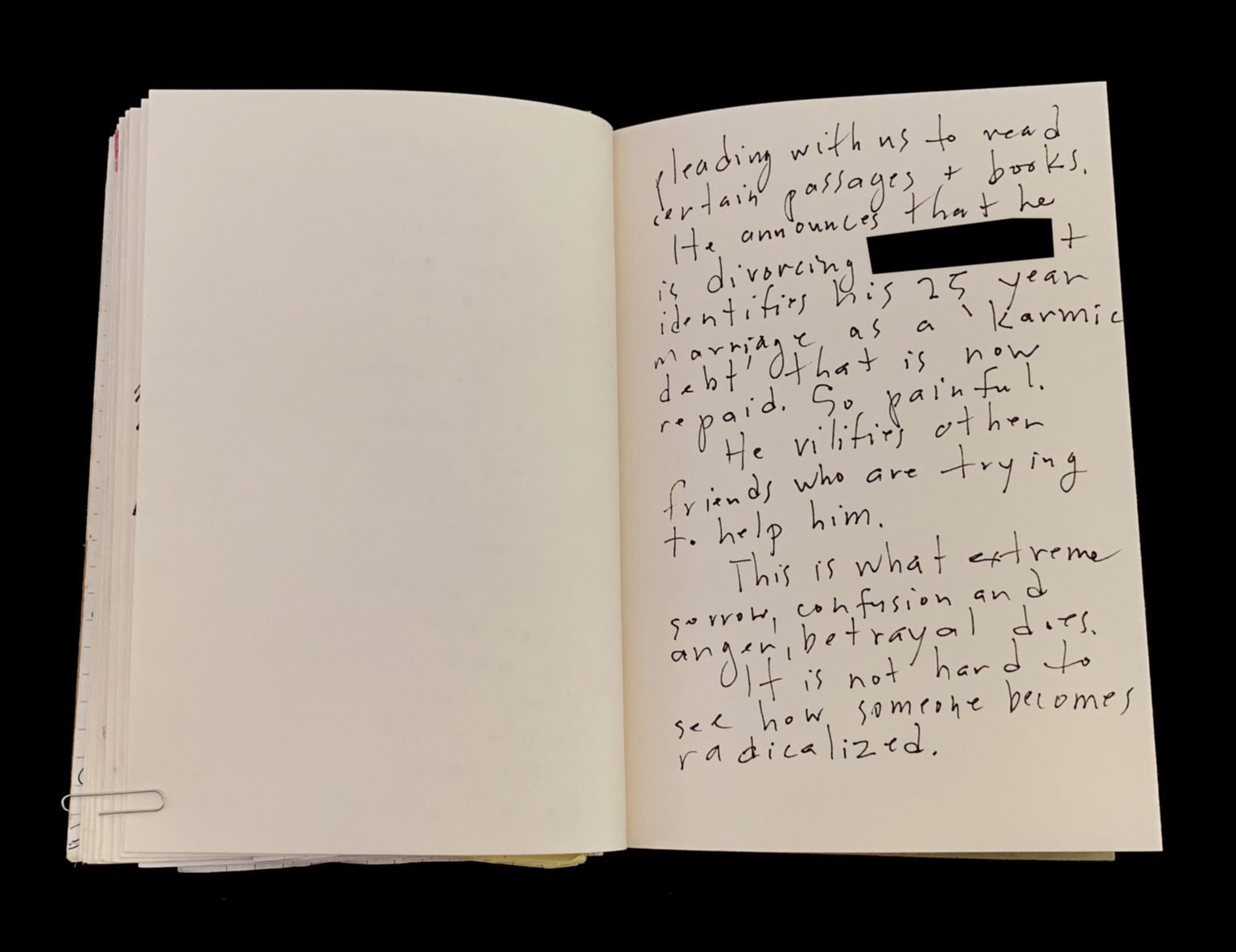 - "pleading with us to read certain passages + books. He announces that he is divorcing [redacted] + identifies his 25 year marriage as a ’karmic debt’ that is now repaid. So painful. He vilifies other friends who are trying to help him. This is what extreme sorrow, confusion and anger/betrayal does. It is not hard to see how someone becomes radicalized."