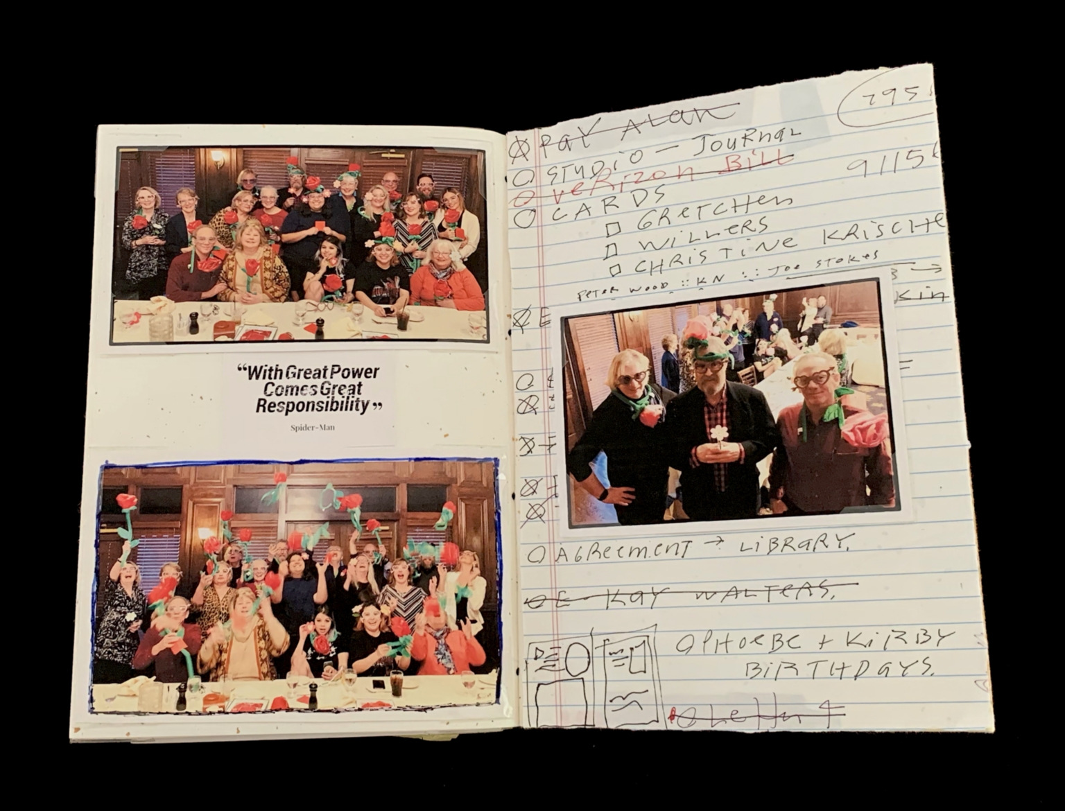 The right page of the notebook contains handwritten notes and sketches. At the top, there is a small photograph of three individuals standing, each decorated with flower balloons. The text includes names and to-do lists, along with some doodles. - Dates Completed