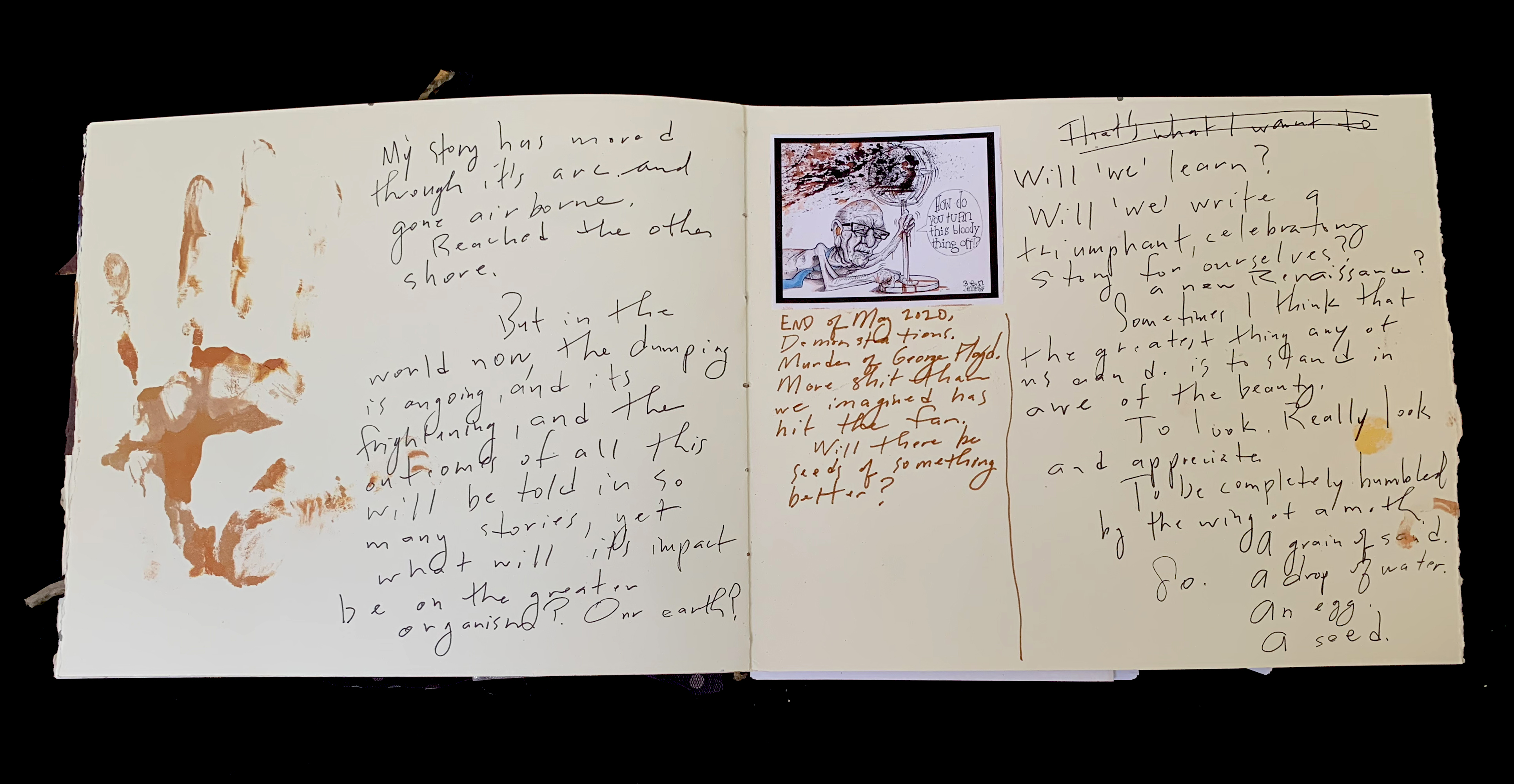 - The page features a large orange handprint on the left side. In the center, there is a cartoon of an elderly man with a cane, holding a cigarette and a glass, with the caption, "How do you turn this bloody thing off?" Below the cartoon, there is a note dated "End of May 2020, Demonstrations, Murder of George Floyd. More shit than we imagined has hit the fan. Will there be seeds of something better?" The right side contains handwritten text discussing personal reflections and questions about the impact of events on the world.