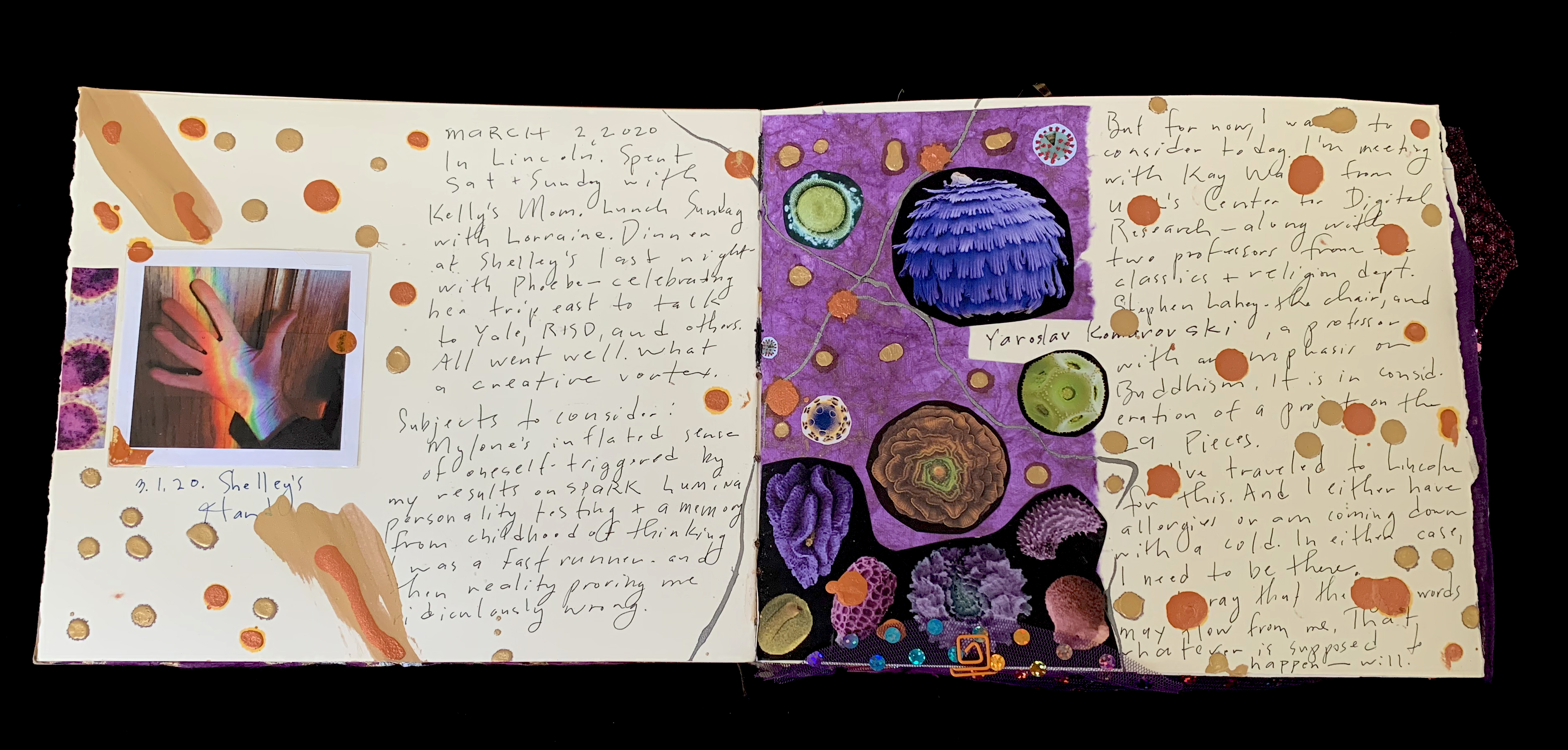 - The left page contains a Polaroid-style photograph of a hand with a rainbow reflection, surrounded by orange and gold circular doodles. The right page is adorned with a purple background featuring various circular illustrations in shades of purple, green, and brown, resembling cellular or molecular structures. The page is decorated with small orange and gold dots, and there are handwritten notes throughout.