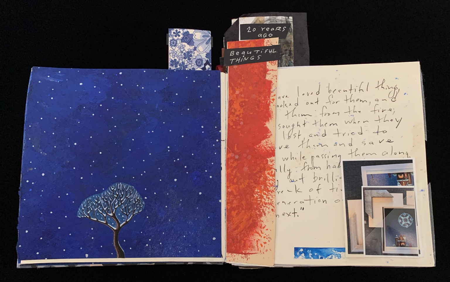 - The image shows an open book with two visible pages. The left page features a deep blue background with white specks resembling stars scattered across it. At the bottom, there is a stylized illustration of a tree with intricate branches and a dark trunk, contrasting against the sky. The right page contains a handwritten text on a cream-colored background. A vertical strip of textured red paint borders the text, adding contrast. Three small, partially overlapping photographs depicting various structures are attached to the lower part of the text. Several bookmarks stick out from the top of the book, one with a floral pattern and two black ones with white text.