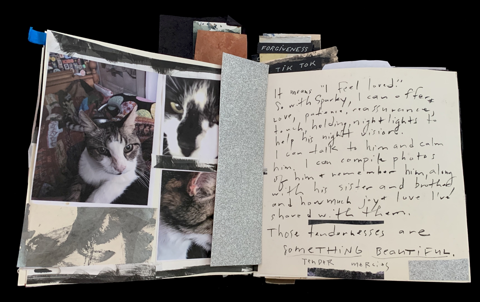 - The image depicts an open scrapbook displaying a collage of photographs and handwritten text. On the left page, there are three photographs featuring a black and white cat in various close-up shots and positions. One photo shows the cat lounging on a colorful, patterned couch. The background includes a snippet of abstract black brush strokes on an off-white page. The right side of the scrapbook contains handwritten text on a cream-colored page, partially obscured by a strip of glittery silver paper. Above this section, tabs labeled "FORGIVENESS" and "TIK TOK" protrude from the top, indicating different sections.