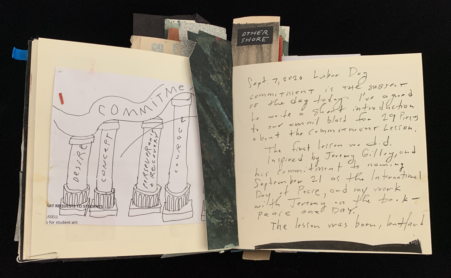 - The image features an open book with pages displaying both a hand-drawn illustration and handwritten text. On the left page, there is a simple black and white drawing of four columns labeled "DESIRE," "CONCEPT," "INTERSECTIONS + RECEIVERS," and "LOGOS," with a banner arching over the columns that says "COMMITMENT." The drawing is attached to the page with a paperclip and a small red tag. The right page contains a handwritten note dated "Sept. 7, 2020 Labor Day," discussing the theme of commitment and referencing an "International Day of Peace." Several layered, colorful paper bookmarks protrude from the top and the side, with one labeled "OTHER SHORE."