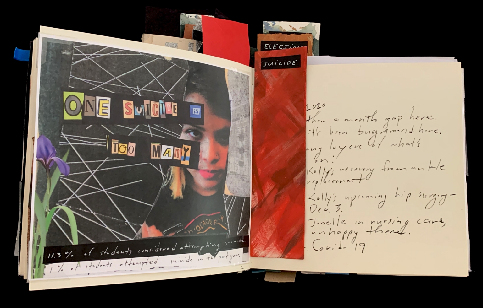 - The image shows an open journal displaying two pages. On the left page, there is a collage featuring a partial portrait of a person's face with colorful letters pasted across it spelling "ONE SUICIDE IS TOO MANY." The background consists of a network of white lines against a dark surface, and there is a purple iris flower at the bottom left corner. At the bottom of this page, handwritten text provides statistical information about student suicide attempts. The right page contains handwritten text detailing various personal events and is bordered by a red vertical bar with the words "ELECTION" and "suicide" visible on tabs extending from the journal.