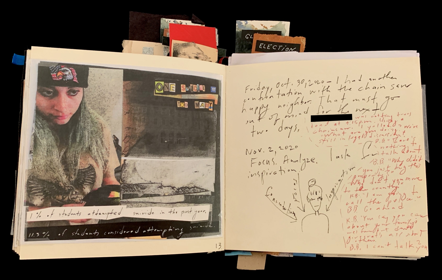 - The image depicts an open journal with two pages filled with text, images, and drawings. The left page features a collage with a woman wearing a patterned headscarf, looking downward to her left. Beside her is a grayscale image of a building with the text "ONE SUICIDE TOO MANY" in colorful, block-style letters. At the bottom, handwritten text reads, "1% of students attempted suicide in the past year. 11.3% of students considered attempting suicide." The right page has handwritten journal entries and sketches in black and red ink. It includes a drawing of a person labeled "Concentration" and notes discussing tasks, dates, and thoughts, densely populated around the page. At the top, several paper tabs stick out with labels like "ELECTION" visible.