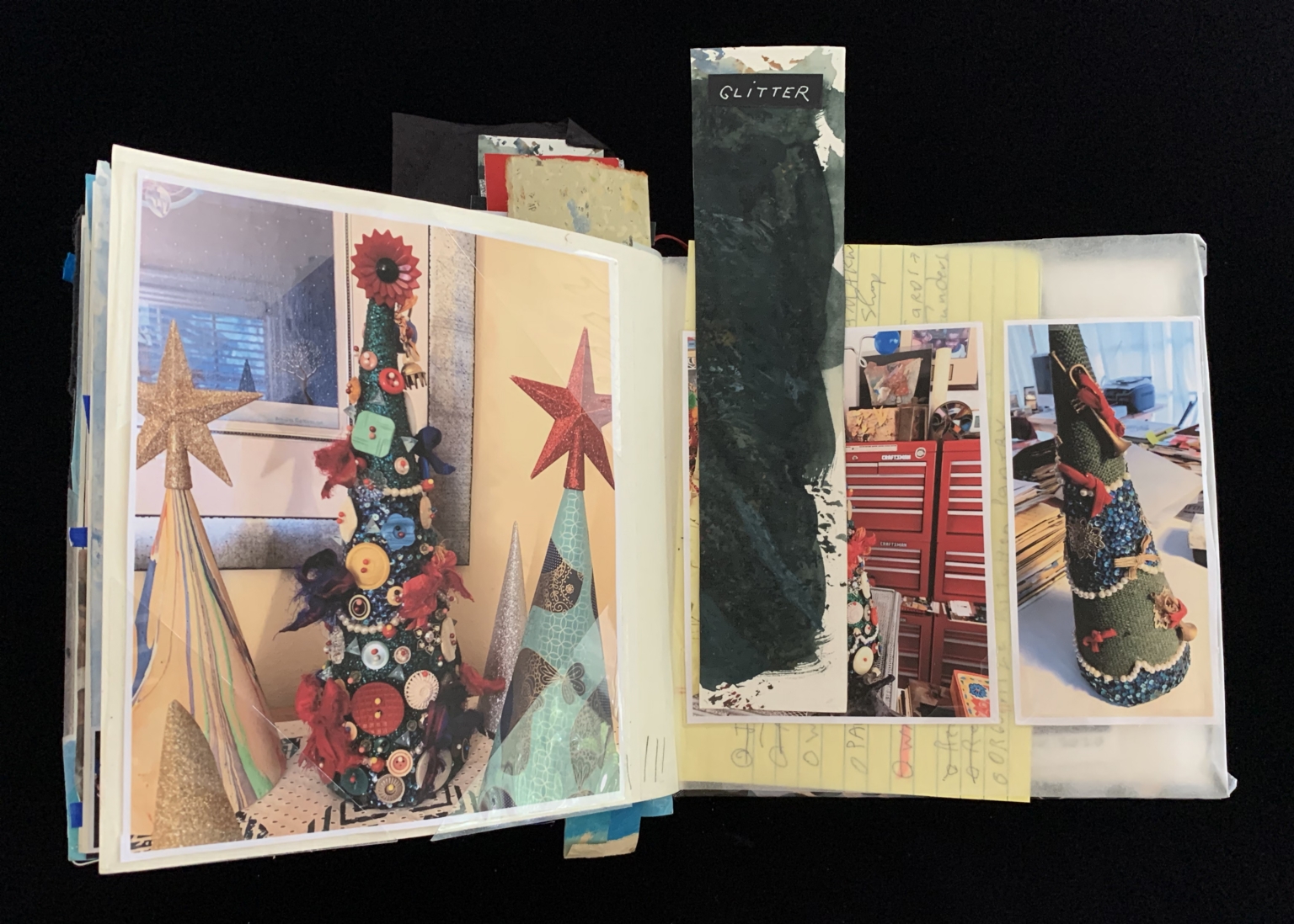 - The image shows an open scrapbook displaying several pages filled with colorful decorations and photographs. On the left page, there are two photographs of cone-shaped Christmas trees, embellished with various buttons and fabric pieces, and topped with star ornaments. The background displays a room with a framed picture on the wall. On the right page, a vertical dark green strip labeled "GLITTER" protrudes from the book, and below are small images with a red tool chest and another decorated cone. Yellow lined paper with faint handwritten notes can be seen partially behind these elements.