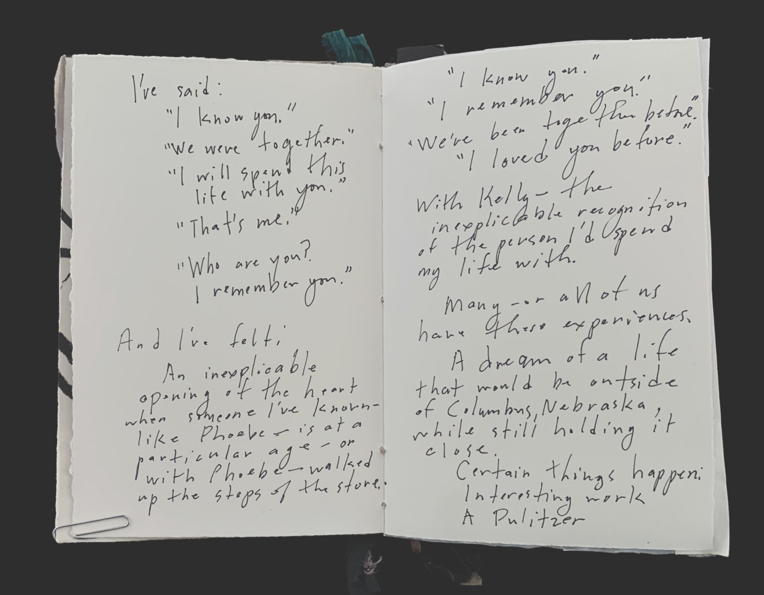 - The image shows an open notebook with handwritten text on two pages. The pages are off-white with visible page texture and are bound in the center. The left page has a paperclip holding it at the bottom, and part of a black and white striped pattern is visible on the edge. The handwriting is in black ink, has a casual and slightly cursive style, with each side having different content. The background is dark, providing contrast to the notebook.