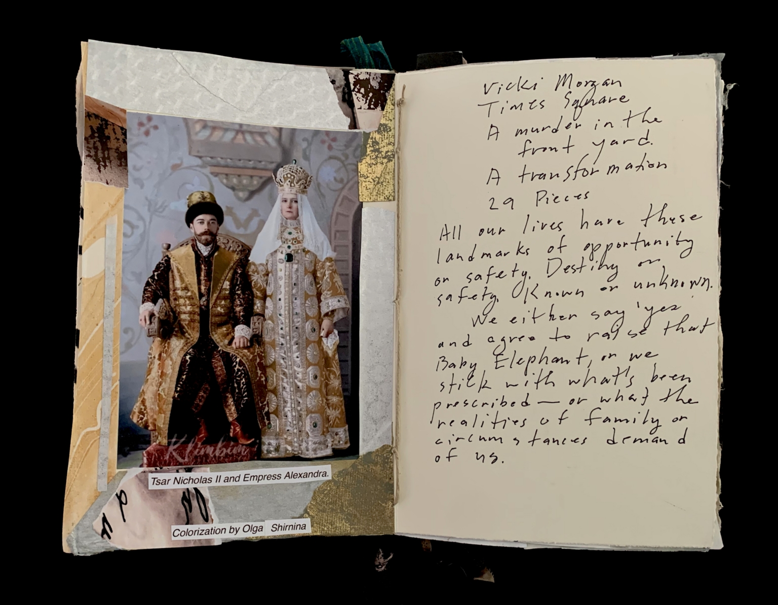 - The image shows an open notebook with a two-page spread. On the left page, there is a photograph of a man and woman dressed in ornate, historical attire. The man, seated, wears a gold and black embroidered coat and a fur hat. The woman stands beside him, wearing a richly decorated gown and an intricate headdress. The photo is framed by a collage of textured paper in various soft colors, including beige, gold, and gray. Below the photograph is a caption with two lines of text. The right page of the notebook contains handwritten text in black ink on cream-colored paper, with uneven, casual handwriting.
