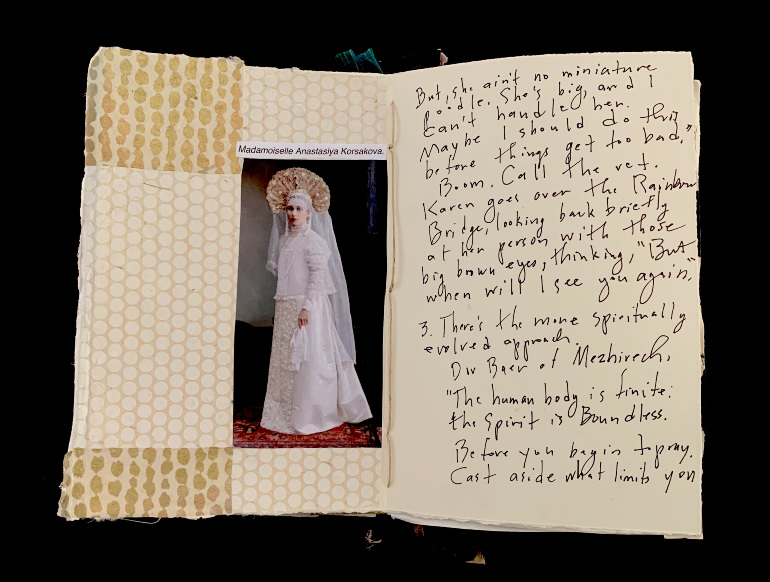- The image shows an open journal spread featuring an artistic collage on the left page and handwritten text on the right. The left page is decorated with textured, patterned paper in shades of cream with gold accents. Overlaying this is a photograph of a person wearing an elaborate costume of a long white gown and an ornate headpiece, identified by a label reading "Mademoiselle Anastasiya Korsakova." The right page contains neatly handwritten text in black ink on off-white paper. The background is dark, emphasizing the open journal.