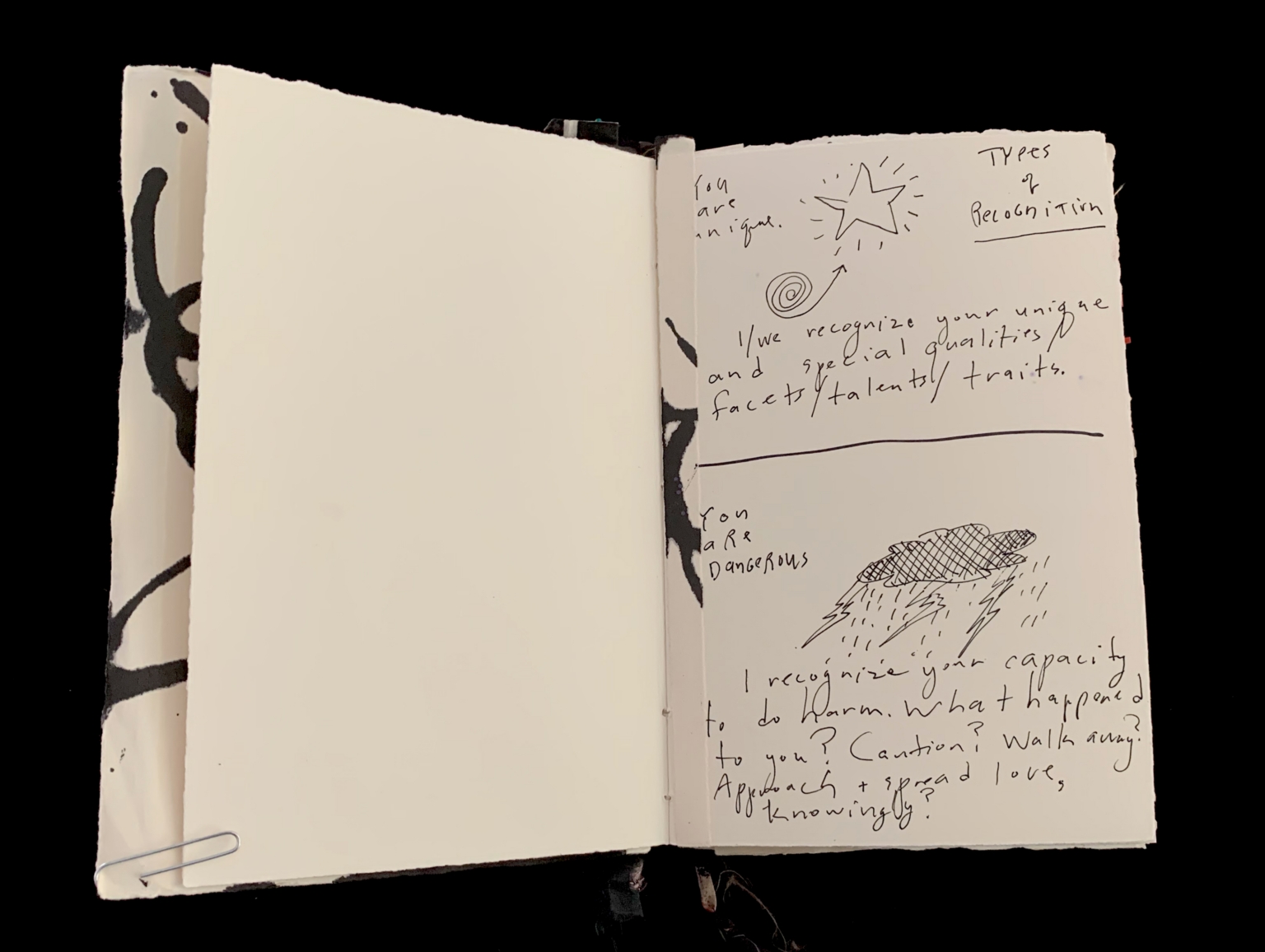 - The image shows an open notebook with two visible pages. The left page is blank, revealing the edge of a page underneath with black abstract patterns. A paperclip is attached to the bottom left corner. The right page contains handwritten text and sketches. At the top right, there is a heading "Types of Recognition" with a line drawing of a star surrounded by lines. Below it, there's a sentence about recognizing qualities and talents. A horizontal line separates this from the bottom section, which includes another brief sentence and a drawing of a rain cloud with raindrops and lightning. The sketches are simple and in black ink.