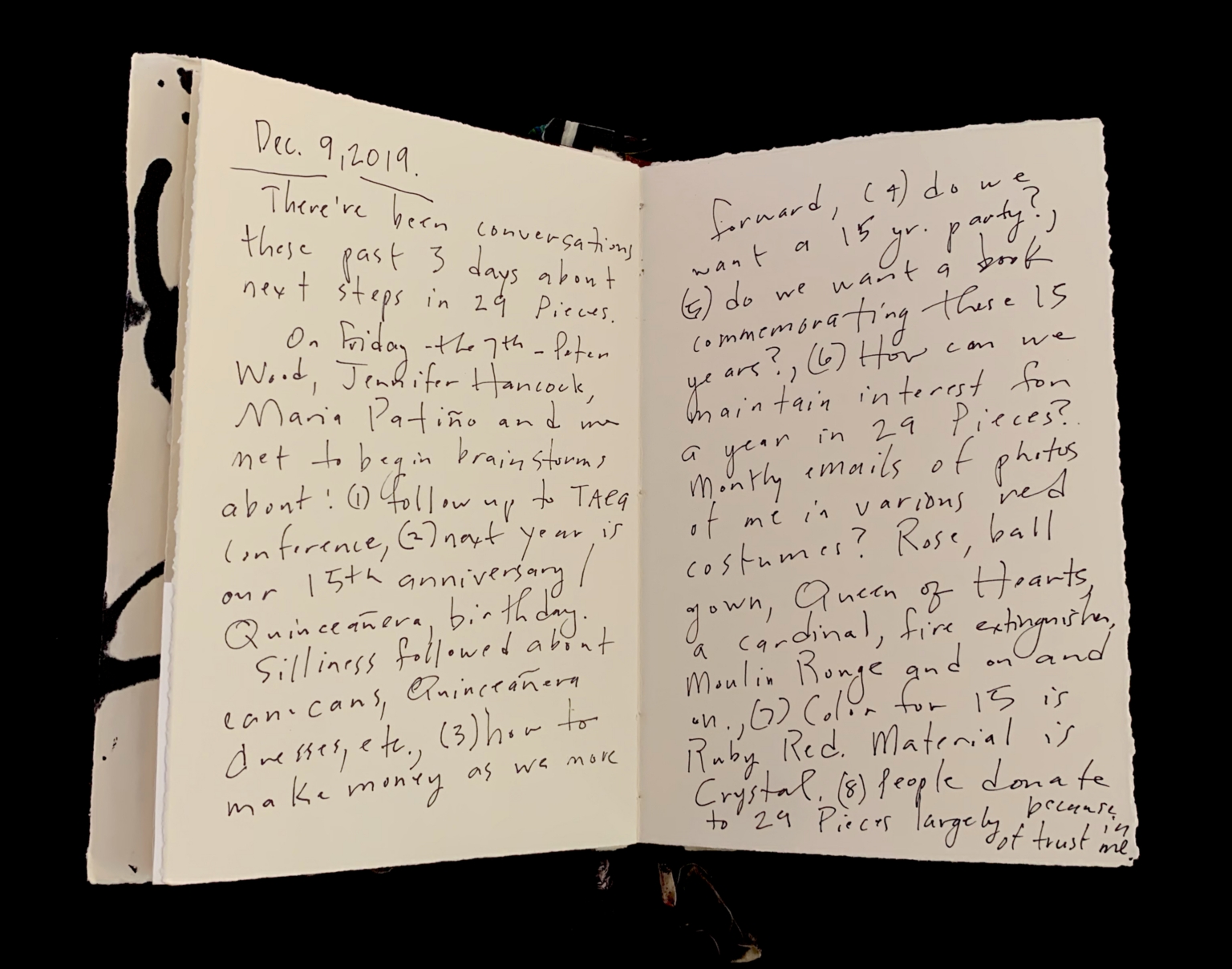 - The image displays an open book with handwritten text in black ink on two facing pages. The pages appear to be creamy white with a slightly textured surface. The handwriting is cursive and somewhat hurried, giving an impression of personal notes or a journal entry. The text begins with a date, "Dec. 9, 2019," at the top of the left page. The content includes discussions about a group meeting, brainstorming sessions, and various celebratory and organizational ideas like a 15-year anniversary party. The right page continues this discussion, pondering ideas such as maintaining interest in group activities and costume themes. The edges of the paper have a slightly rough, untrimmed look. The background is black, highlighting the book.