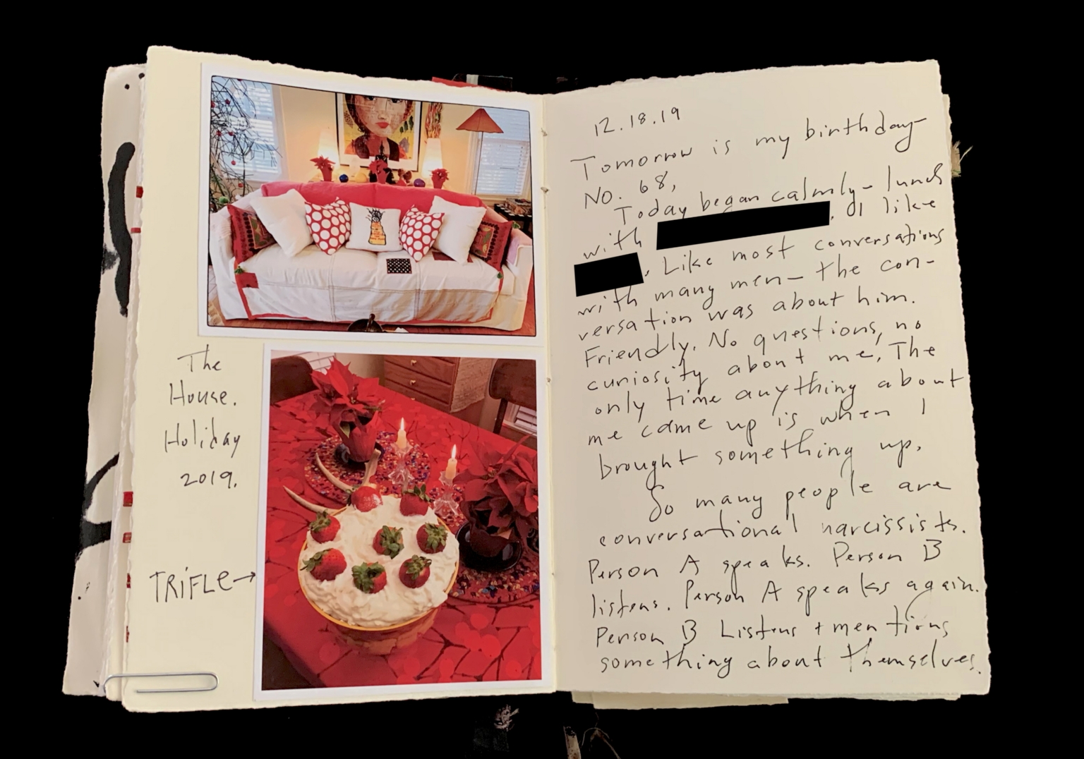 The right page is filled with handwritten text in black ink with sections obscured by black redactions. The notes appear to be reflective, dated "12.18.19" and talk about a personal experience and observations on conversations. - Dates Completed