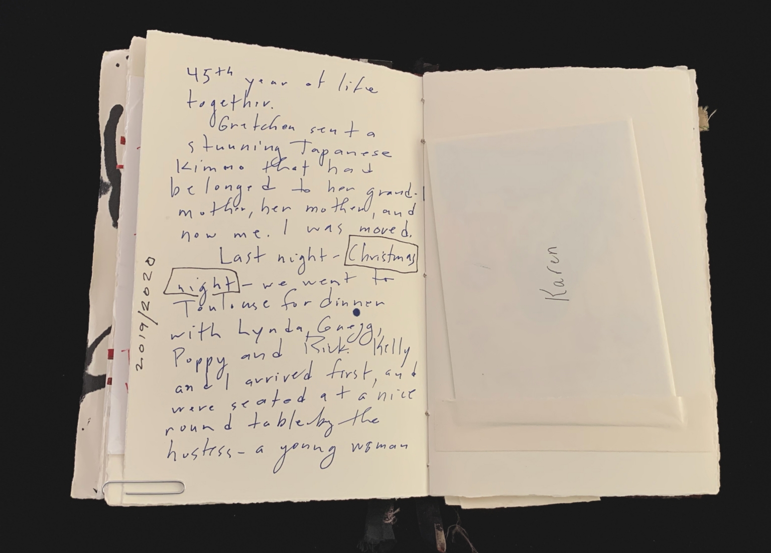 - The image shows an open notebook placed on a dark surface. The left page contains handwritten text in blue ink. Some text is highlighted with boxes and underlines. The content reflects a personal narrative about a gift and a dinner event, including a date written vertically along the edge. The right page is mostly empty except for a folded piece of white paper inserted loosely, with "Karen" handwritten on it. The notebook is bound with a visible stitch on the right side.