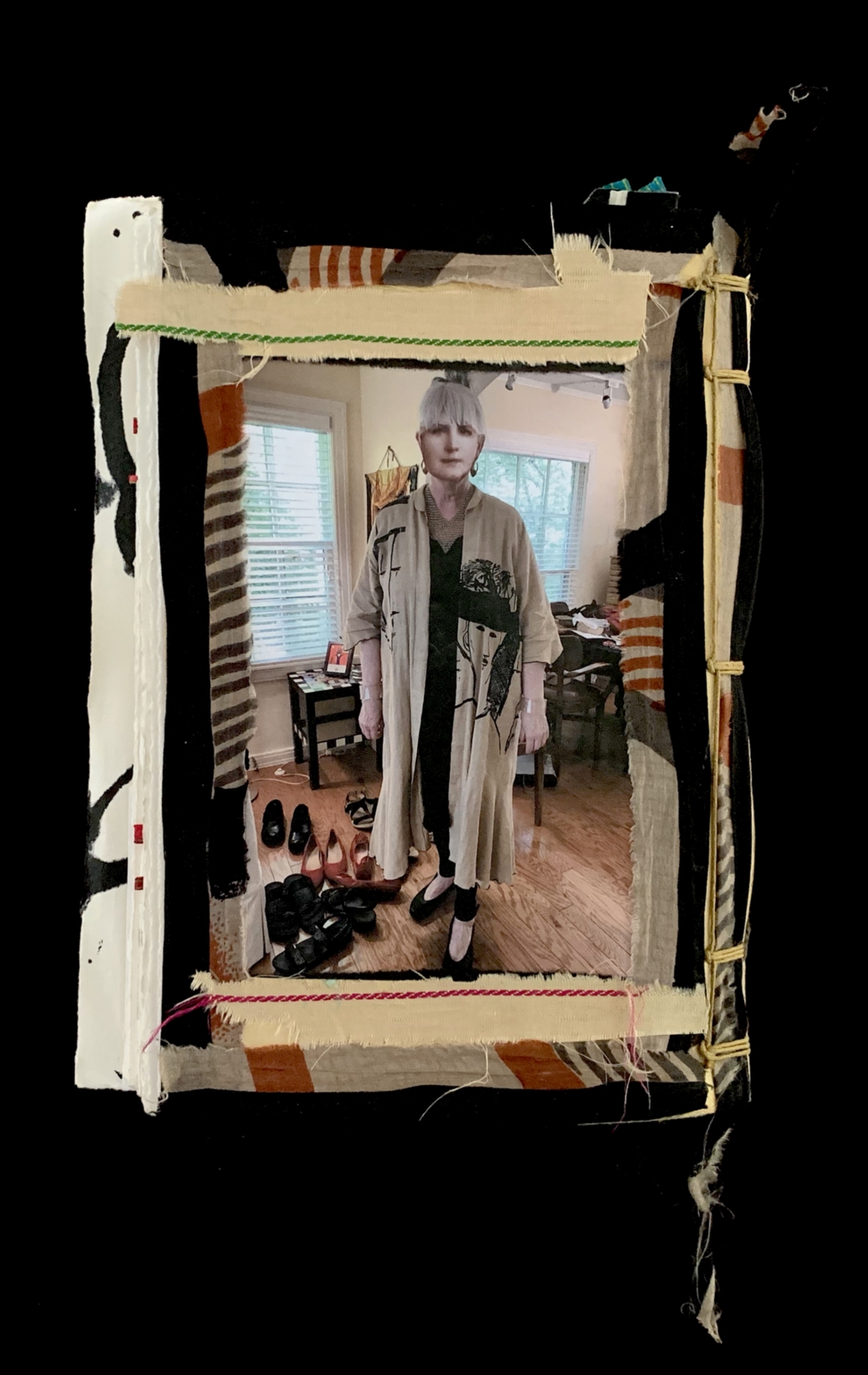 - The image features a person standing indoors on a wooden floor. They are wearing a long, light-colored coat adorned with artistic designs, over a dark outfit. Their hair is light and styled in a short, tidy cut. Behind them are windows with blinds partially drawn, revealing green foliage outside. On the floor, there is an assortment of shoes organized near a small table, which holds a picture frame and other small items. The outer edges of the image are bordered by various fabrics, in patterns and textures, with colors like black, white, orange, and beige, stitched or tied together with threads and strings.