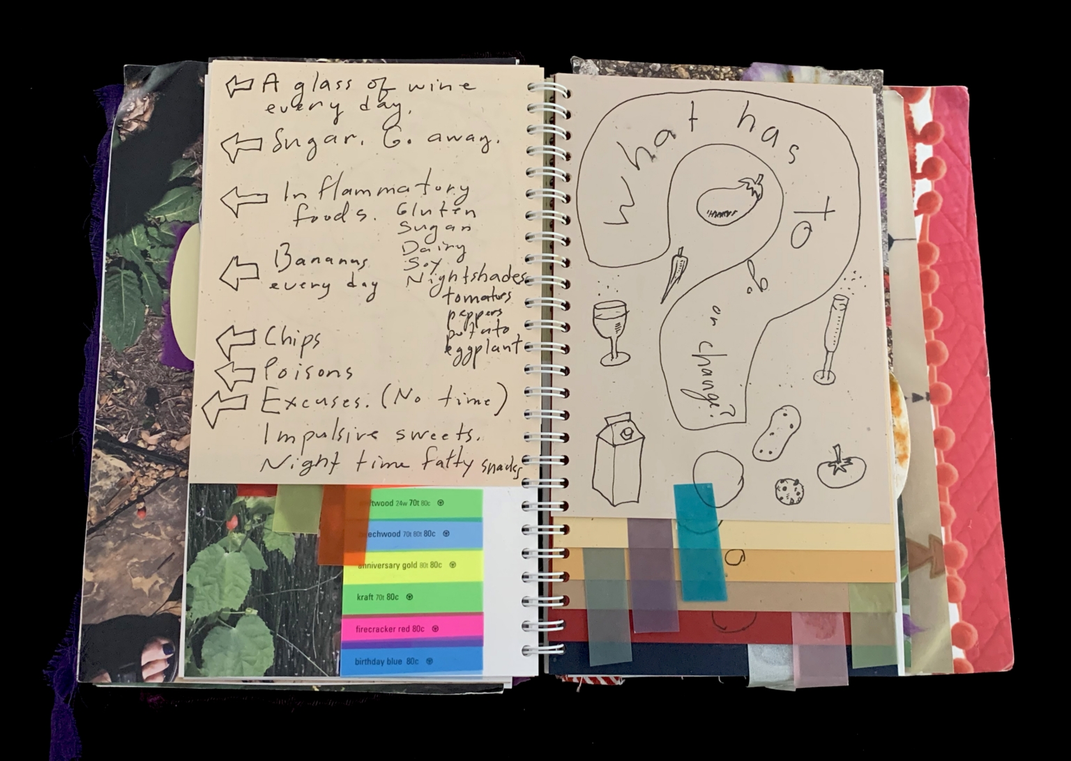 - The page features a variety of elements including handwritten notes, doodles, and color swatches. The notes are written in black ink and include phrases like "A glass of wine every day," "Sugar. Go away," and "Inflammatory foods: Gluten, Sugar, Dairy, Soy, Nightshades." There are also drawings of a face with a question mark, a glass of wine, a carrot, a potato, a tomato, and a milk carton. The color swatches at the bottom are in shades of green, blue, and red.
