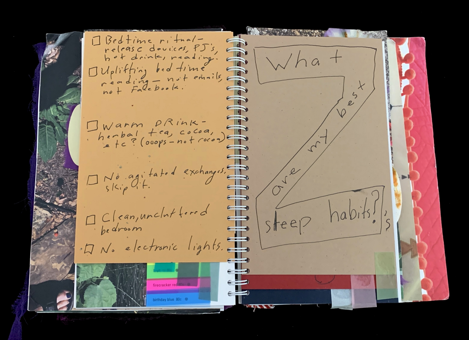 - The page is part of a spiral-bound notebook. The left side contains a list of bedtime habits written in a handwritten font, with checkboxes next to each item. The right side has a large question written in a similar handwritten style, framed within a hand-drawn shape. The background includes various cut-out images and papers, adding a collage-like appearance.