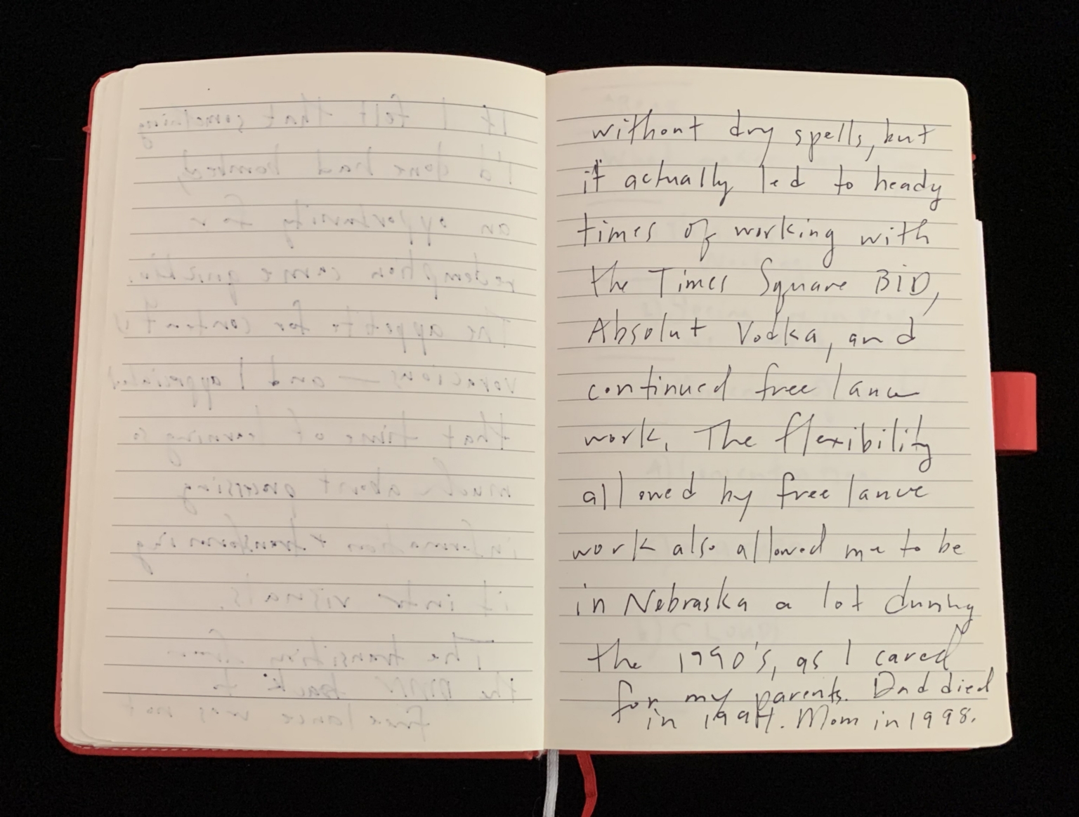 - "without dry spells, but it actually led to heady times of working with the Times Square BID, Absolut Vodka, and continued free lance work. The flexibility allowed by free lance work also allowed me to be in Nebraska a lot during the 1990's, as I cared for my parents. Dad died in 1994, Mom in 1998."