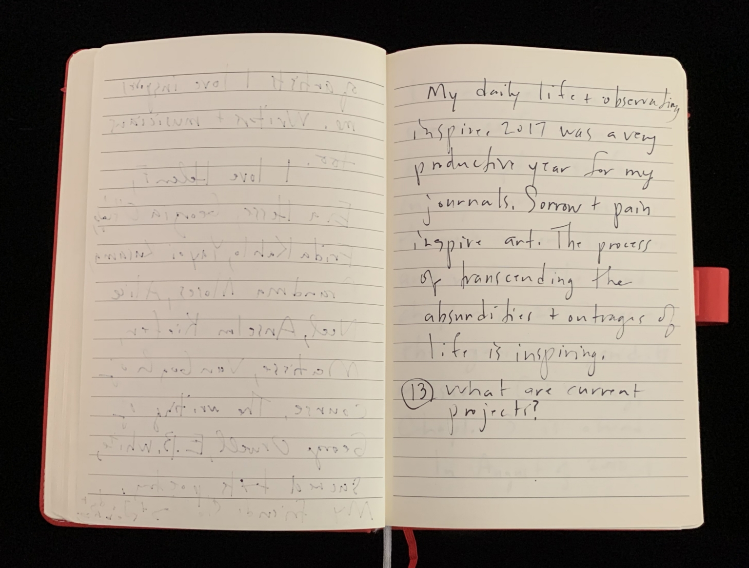- The image displays an open notebook with a red cover. The left page contains faint, indiscernible handwriting. The right page features clearer handwriting in black ink. The text discusses themes such as daily life and inspiration, noting that sorrow and pain inspire art. The page also contains a numbered question related to current projects. The writing is neatly aligned along the page's printed lines.
