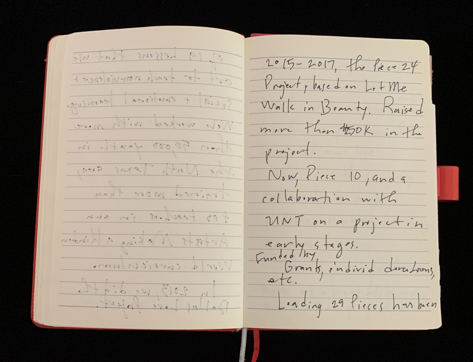 - 2015-2017, the Piece 24 Project, based on Let Me Walk in Beauty. Raised more than $50K in the project. Now, Piece 10, and a collaboration with UNT on a project in early stages. Funded by Grants, individ donations, etc. Leading 29 Pieces...