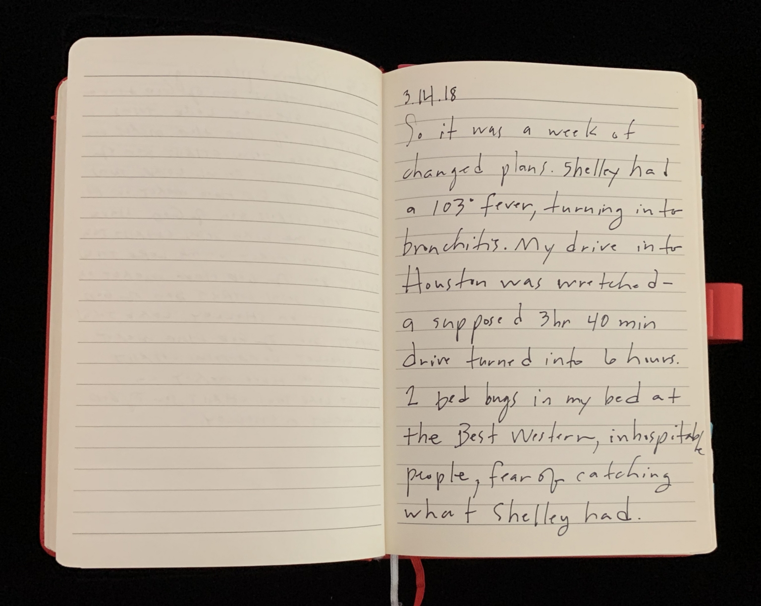 - The image shows an open notebook with lined pages against a black background. The left page is blank, while the right page contains handwritten text in black ink. The notebook has a red spine and a red elastic band visible along the right edge. The writing is neat and fills most of the lined page. The date "3.14.18" is written at the top, followed by a narrative about a week of changed plans, mentioning a fever and a problematic drive.