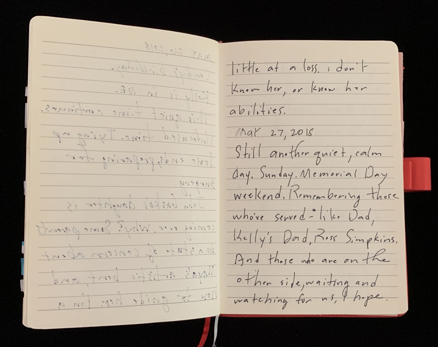 Right page: "little at a loss, I don't know her, or know her abilities. May 27, 2018. Still another quiet, calm day, Sunday. Memorial Day weekend. Remembering those who've served: like Dad, Kelly's Dad, Ross Simpkins. And those who are on the other side, waiting and watching for us, I hope." - Rights