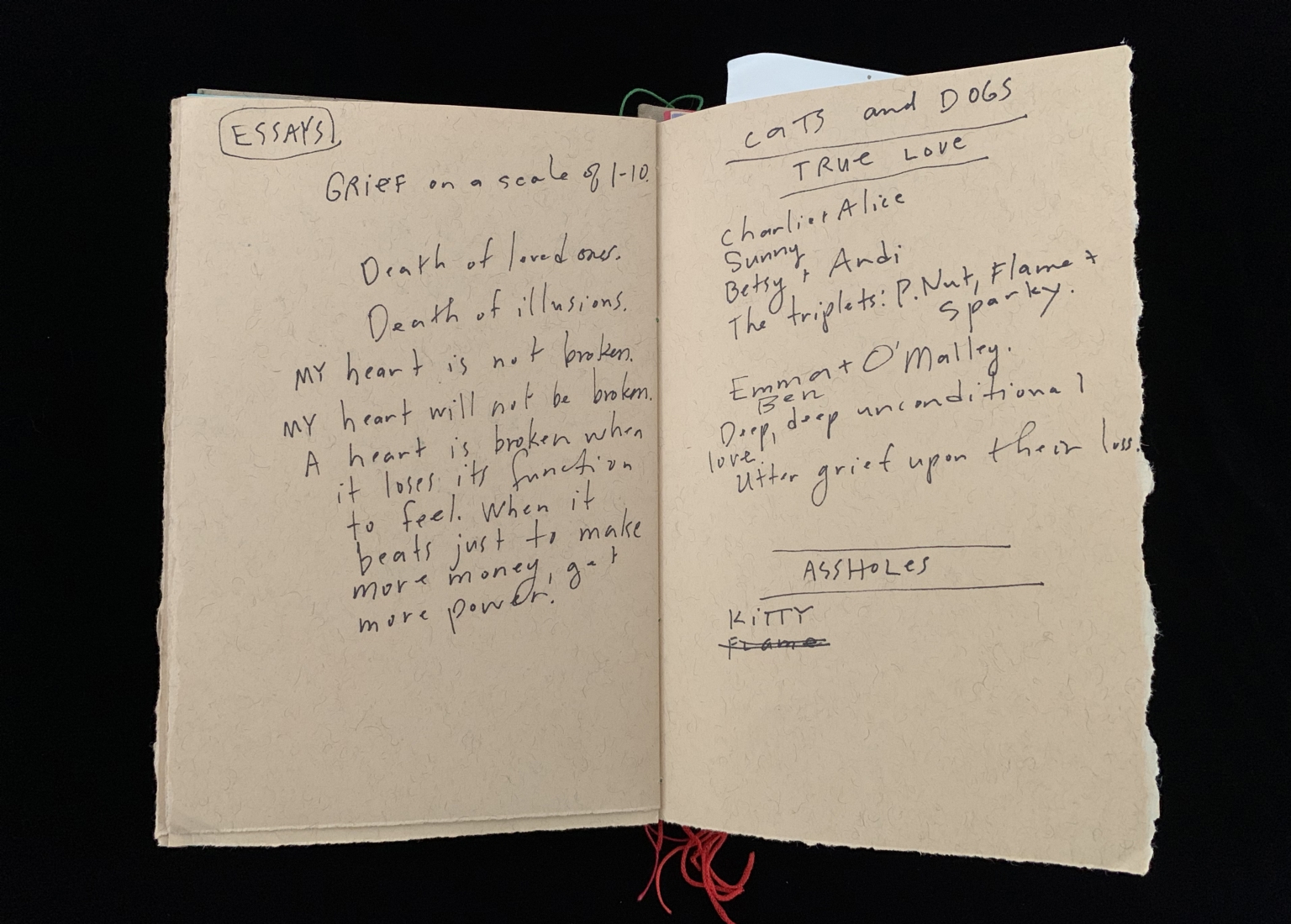 - The image displays an open, handwritten notebook with two pages visible against a black background. The left page, titled "ESSAYS" at the top, contains a section labeled "GRIEF on a scale of 1-10" followed by lines discussing themes of loss and brokenness in a personal, reflective manner. The handwriting is in black ink and appears casual and spontaneous. The right page is titled "CATS and DOGS" with sections labeled "TRUE LOVE" and "ASSHOLES." Beneath "TRUE LOVE," there are names listed, followed by a phrase about deep, unconditional love. In the section labeled "ASSHOLES," a single name is mentioned. The right page has a visibly jagged edge, suggesting it may have been torn.