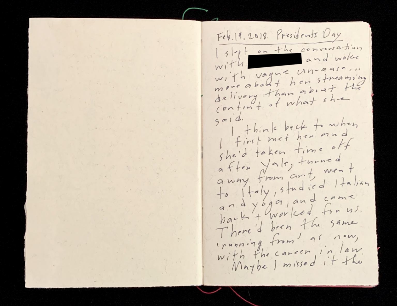 - The image shows an open notebook on a black background. The left page is blank, while the right page contains handwritten text in black ink. The text begins with a date, "Feb. 19, 2018," followed by the words "President's Day." The writing occupies most of the right page, with some words redacted. The text is written in a neat, cursive style.