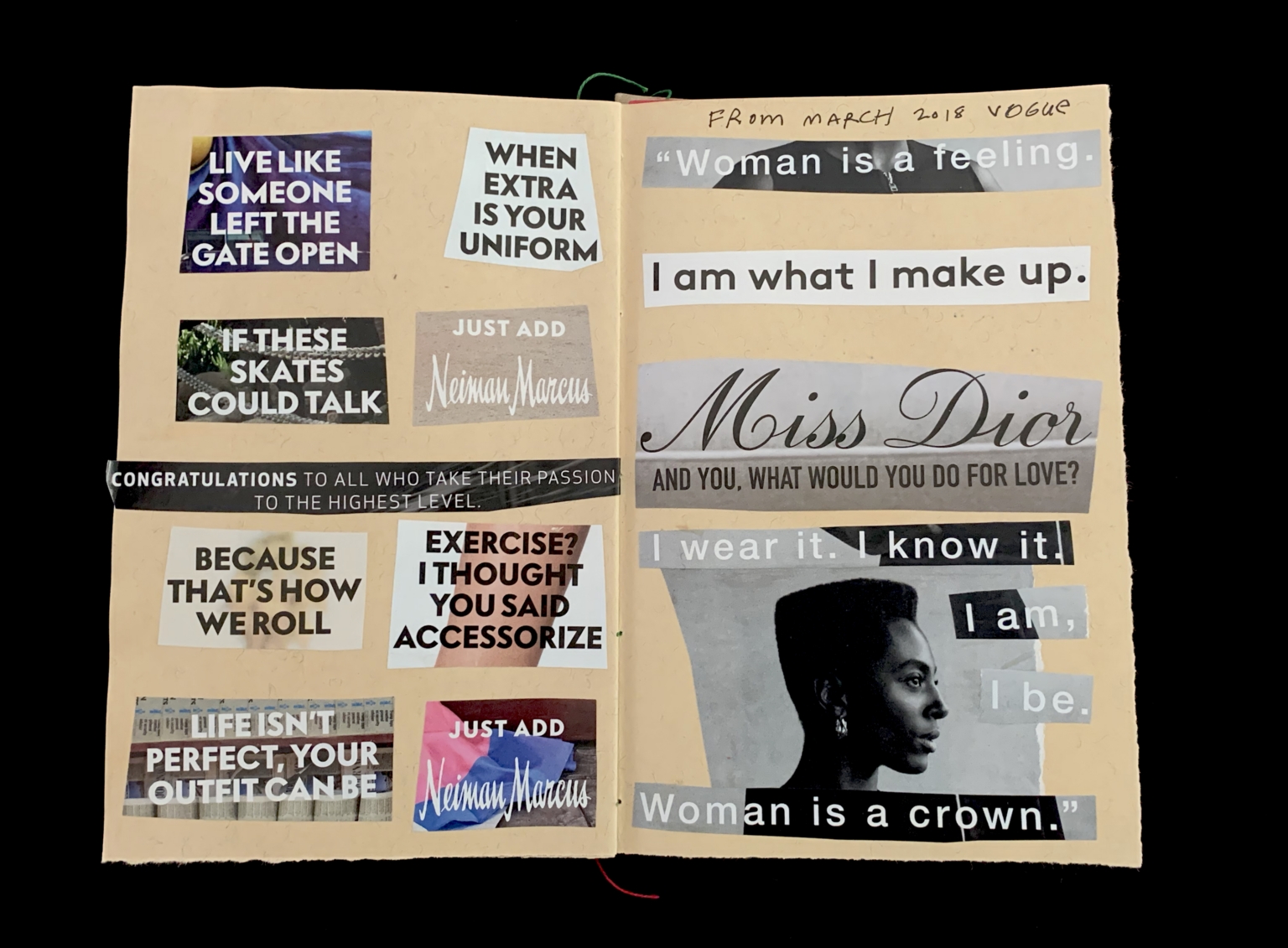 The right page features a black and white profile photograph of a woman with text overlaying and surrounding it. The phrases include "Woman is a feeling," "I am what I make up," "Miss Dior," "I wear it. I know it," and "Woman is a crown." The collage has a handwritten note at the top edge stating "FROM MARCH 2018 VOGUE." - Dates Completed