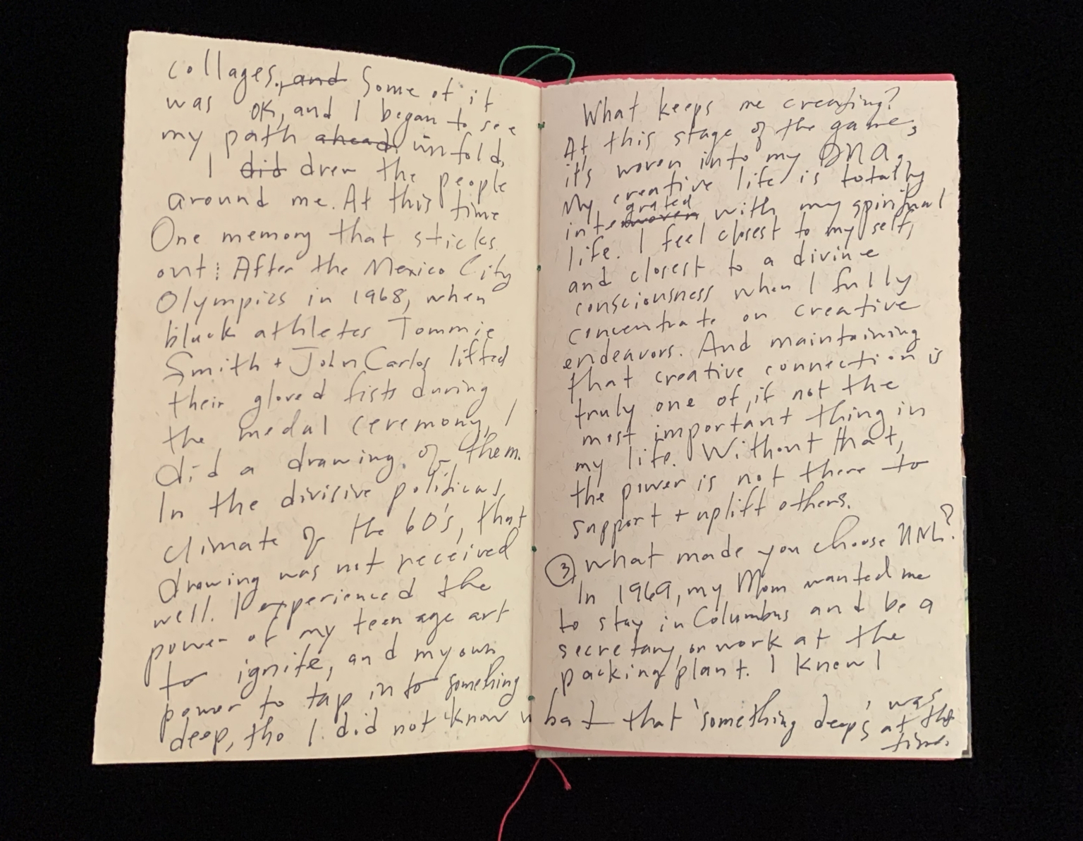 collages, and some of it was O.K., and I began to see my path ahead unfold. I did draw the people around me. At this time one memory that sticks out: After the Mexico City Olympics in 1968, when black athletes Tommie Smith + John Carlos lifted their gloved fists during the medal ceremony, I did a drawing of them. In the divisive political climate of the 60's, that drawing was not received well. I experienced the power of my teenage art for igniting and my own power to tap in to something deep, tho I did not know what that something was at the time.