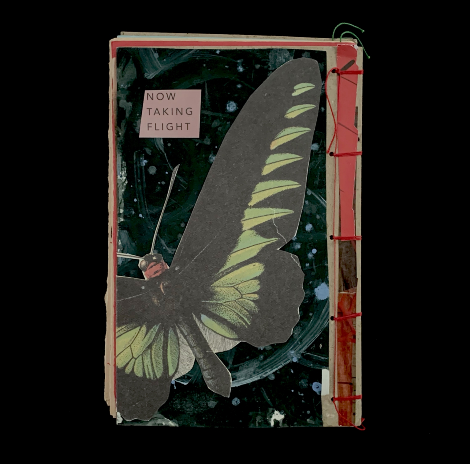 - The image shows the cover of a handmade, bound journal. The forefront features a large black and green butterfly cut-out positioned diagonally across the cover. The butterfly has a vivid red head and antennae visible at the top left. The background consists of a dark, textured design with circular patterns and white specks, reminiscent of abstract art or a night sky. The book is bound on the right side with a red cover strip and red stitching. In the top left corner, there is a small, pink rectangle with black text.