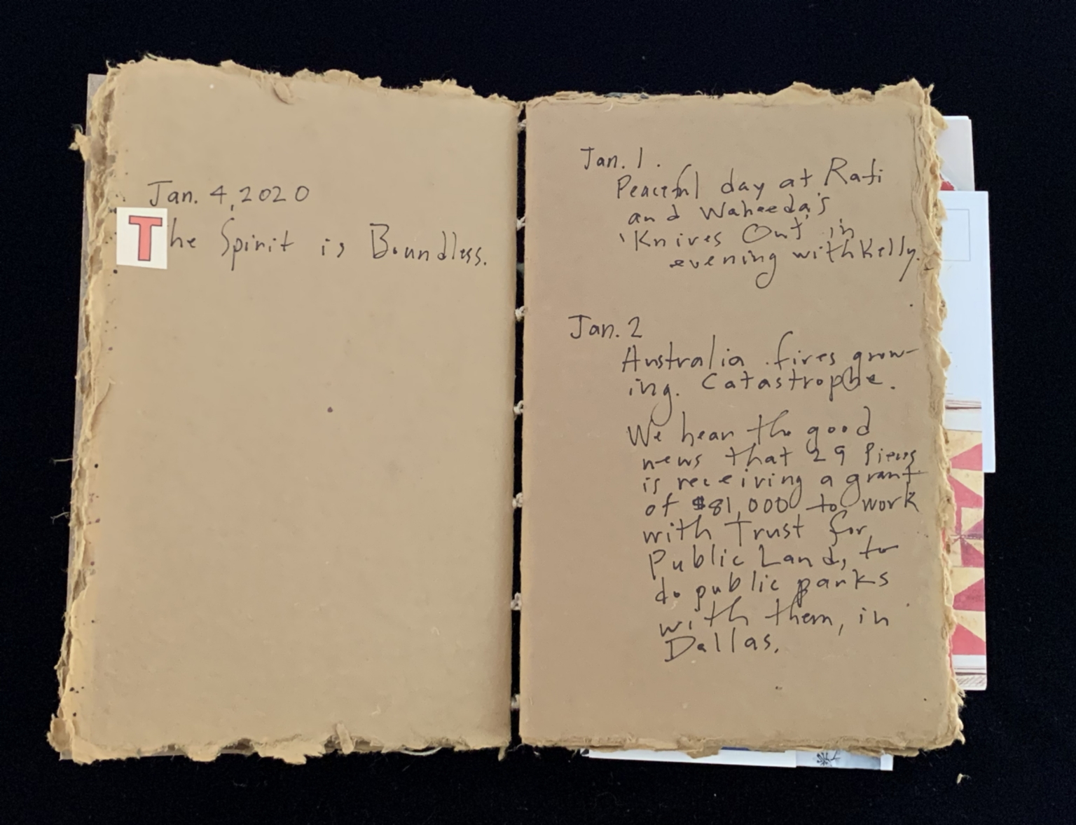 - The image shows an open journal with two pages visible. The journal pages have a rough, untrimmed edge and a thick, textured look, suggesting aged or handmade paper. On the left page, there is a handwritten entry with the date "Jan. 4, 2020" at the top. The text reads, "The Spirit is Boundless," with the initial "T" being a bold red and white cut-out letter pasted onto the page. The right page features two dated entries. The first entry is dated "Jan. 1" and notes a peaceful day at Rati and Waheeda's, including watching the film "Knives Out" with someone named Kelly. The second entry is dated "Jan. 2," discussing the worsening of Australian fires and sharing news about a grant for public park projects in Dallas.