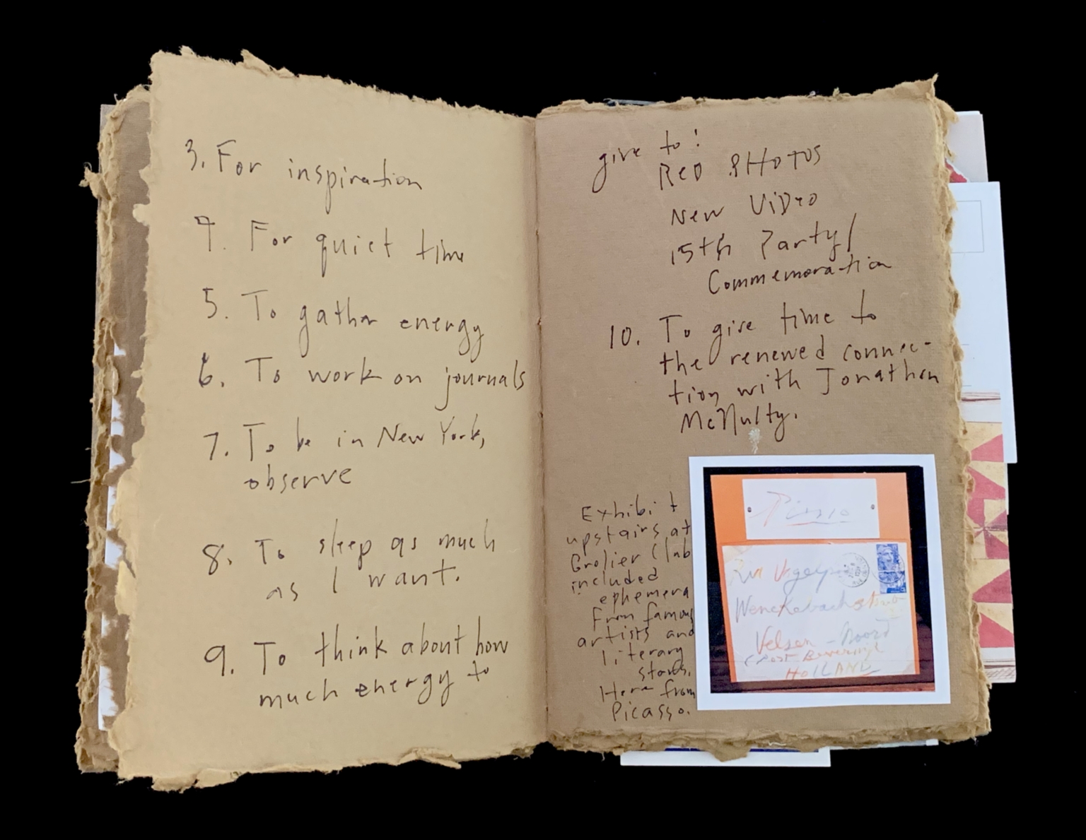 - The image shows an open journal with two pages displayed. The pages are made of rough, beige paper with a slightly textured surface. On the left page, numbered handwritten notes are listed vertically in brown ink. The right page contains more handwritten notes in similar ink and a small, affixed image or photograph at the bottom right corner. This insert features a mix of colors and has text on it. The journal's edges are uneven, contributing to a rustic appearance. Additional paper with abstract patterns is partially visible beneath the journal's right edge.