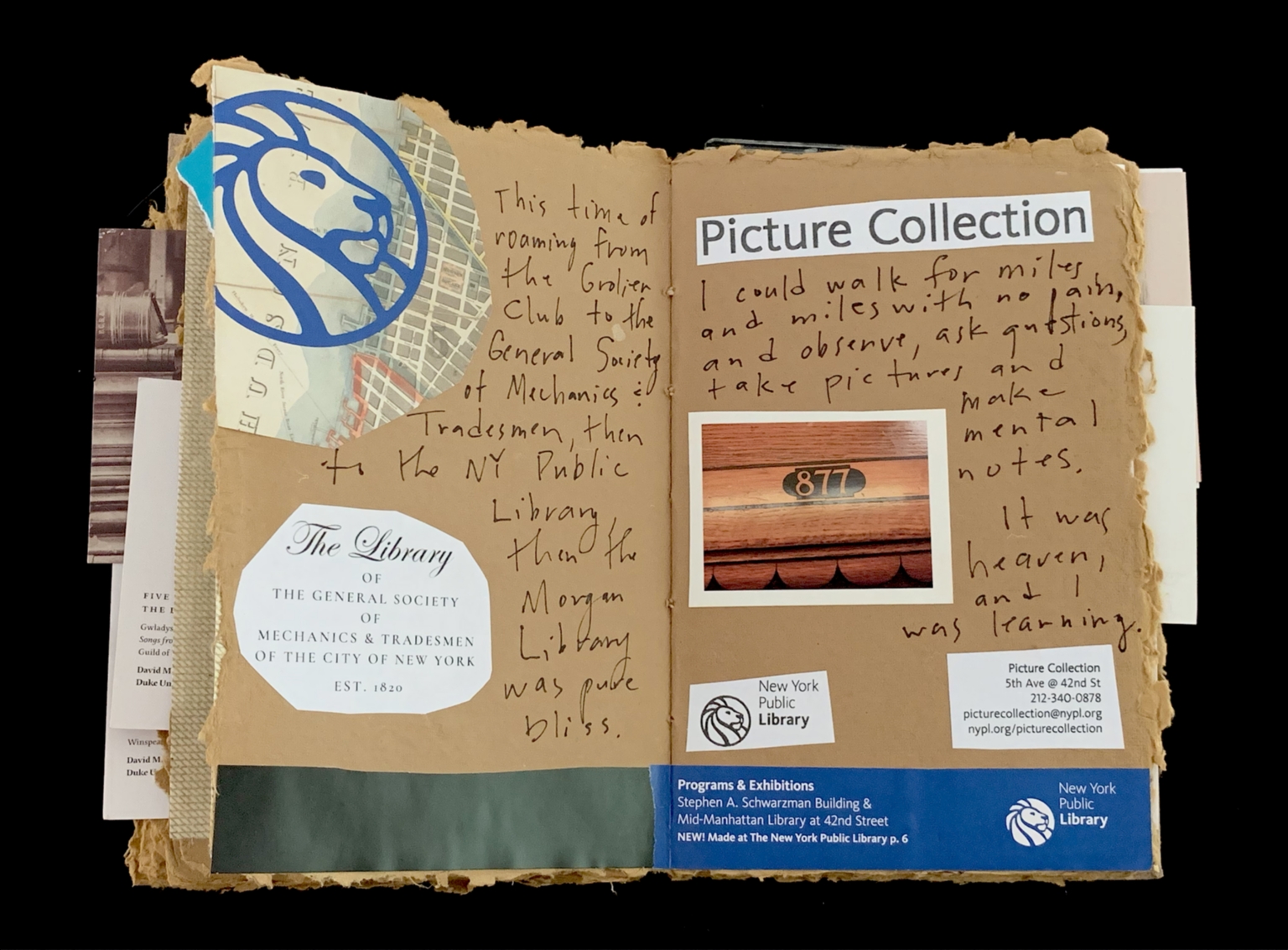 - The image shows an open scrapbook with two visible pages filled with various elements. The left page features a vintage, rough-edged design with a collage of cutouts. At the top, there is a blue lion logo. Below, a text-filled cutout reads, “The Library of The General Society of Mechanics & Tradesmen of The City of New York EST. 1820.” Handwritten text on this page discusses roaming between different libraries. The right page, marked as "Picture Collection," has another handwritten note reflecting on the enjoyment of exploration and learning. Below this text is a small photograph of a plaque with the number “877.” The page's bottom corner features the New York Public Library logo and contact information.