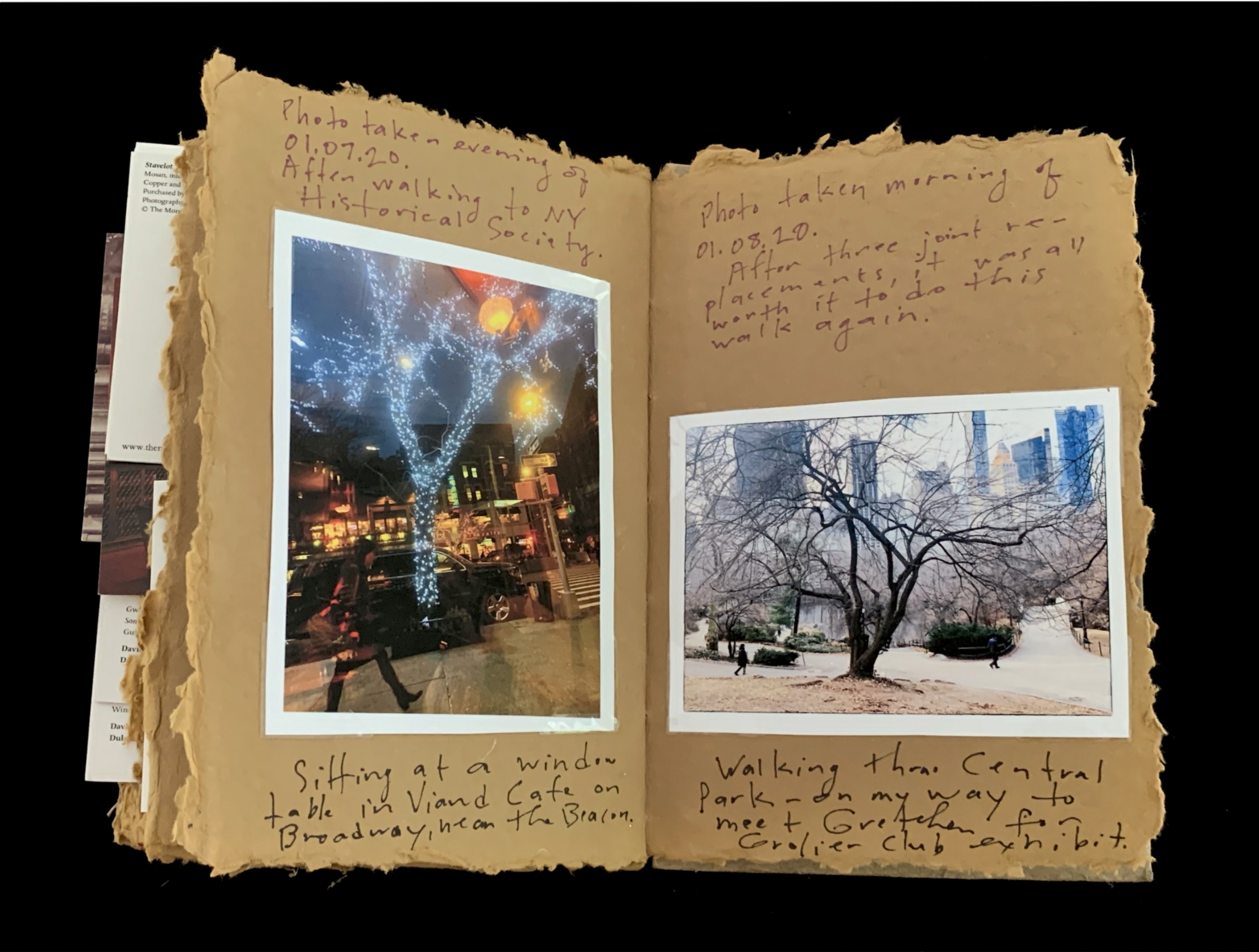 Left page, above photo: "Photo taken evening of 01.07.20. After walking to NY Historical Society."
