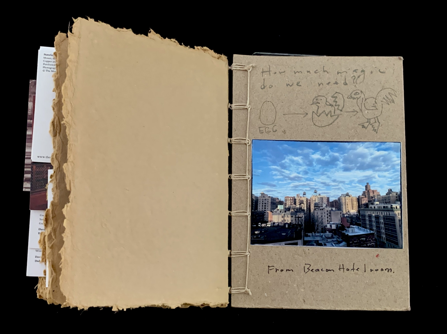 - The image shows an open book with rustic, textured pages and a hand-bound cover. The left page is blank, while the right page features hand-drawn sketches and notes. At the top right, there are three simple drawings illustrating the stages from an egg to a chick, then to a chicken, with the word "EGG" labeled under the first drawing. Below, there's a mounted photograph of a cityscape with an expansive blue sky and scattered clouds above tall buildings. Handwritten below the photo are the words "From Beacon Hotel room."