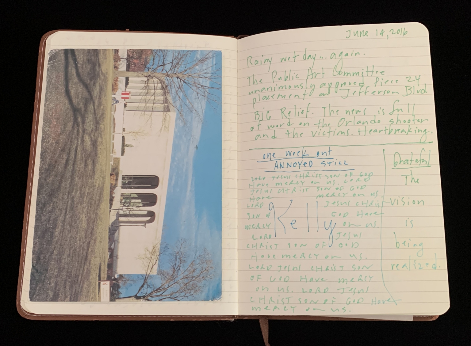 - Mantram pages; Beseeching the divine; Orlando shooting; Feeling abandoned; Distance from God; Moral high ground; American hypocrisy; Drone strikes; President Obama; Collateral damage; Piece 24 presentation; City of Dallas; Bryn the Corgi; Pet loss; Euthanizing dog; Grief; Presentation aftermath; Mass shooting; Public Art Committee; Approval of Piece 24; Quiet house; Hosting dinner; Kelly in Nebraska; Helping his Mom; Inner calling; Tanya Conovaloff surgery; Roxana health emergency; July remembrances; Barbara’s death; Mom’s birthday; Family picnics; Communion of grief; Police shooting; 29 Pieces messaging; Will to be better; Raw grief; One pure language; Hazrat Khan quote; Nice France violence; Baton Rouge killings; Mercy; History repeating; Pulitzer Centennial; War photographer questions