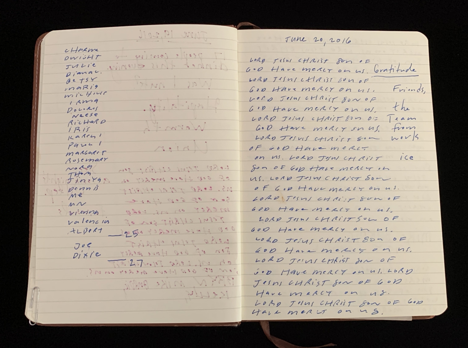 - Mantram pages; Beseeching the divine; Orlando shooting; Feeling abandoned; Distance from God; Moral high ground; American hypocrisy; Drone strikes; President Obama; Collateral damage; Piece 24 presentation; City of Dallas; Bryn the Corgi; Pet loss; Euthanizing dog; Grief; Presentation aftermath; Mass shooting; Public Art Committee; Approval of Piece 24; Quiet house; Hosting dinner; Kelly in Nebraska; Helping his Mom; Inner calling; Tanya Conovaloff surgery; Roxana health emergency; July remembrances; Barbara’s death; Mom’s birthday; Family picnics; Communion of grief; Police shooting; 29 Pieces messaging; Will to be better; Raw grief; One pure language; Hazrat Khan quote; Nice France violence; Baton Rouge killings; Mercy; History repeating; Pulitzer Centennial; War photographer questions