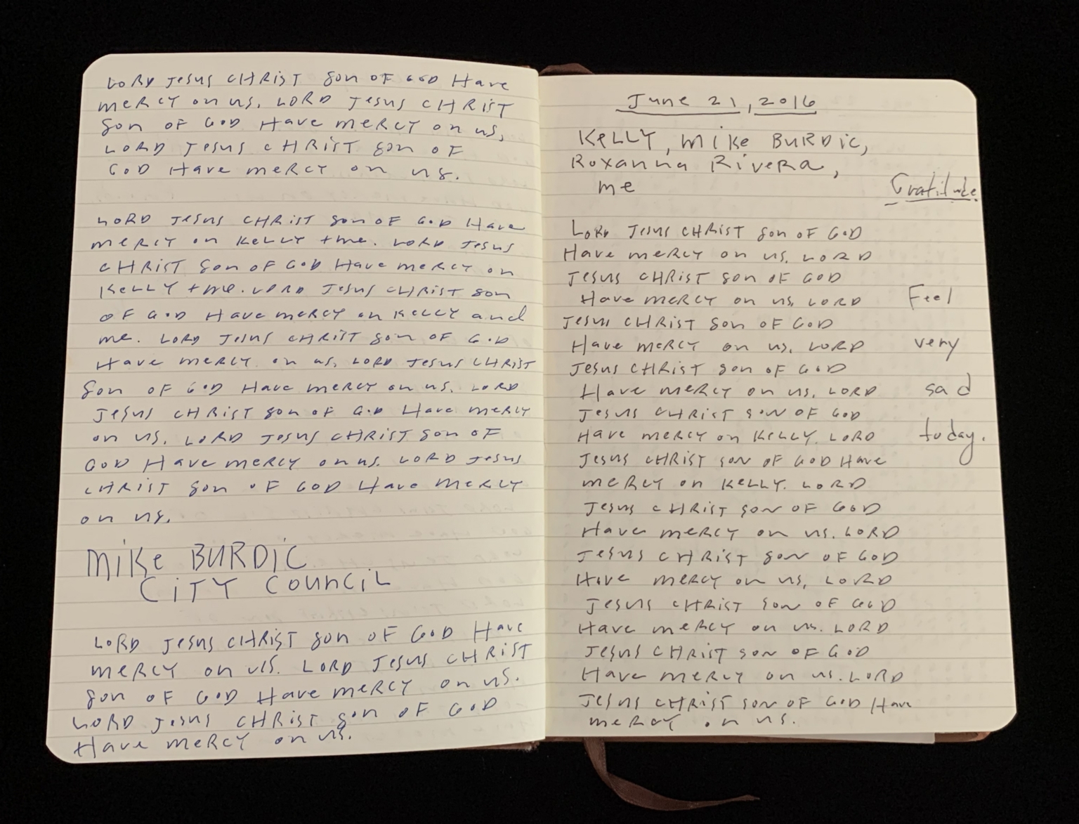 - Mantram pages; Beseeching the divine; Orlando shooting; Feeling abandoned; Distance from God; Moral high ground; American hypocrisy; Drone strikes; President Obama; Collateral damage; Piece 24 presentation; City of Dallas; Bryn the Corgi; Pet loss; Euthanizing dog; Grief; Presentation aftermath; Mass shooting; Public Art Committee; Approval of Piece 24; Quiet house; Hosting dinner; Kelly in Nebraska; Helping his Mom; Inner calling; Tanya Conovaloff surgery; Roxana health emergency; July remembrances; Barbara’s death; Mom’s birthday; Family picnics; Communion of grief; Police shooting; 29 Pieces messaging; Will to be better; Raw grief; One pure language; Hazrat Khan quote; Nice France violence; Baton Rouge killings; Mercy; History repeating; Pulitzer Centennial; War photographer questions