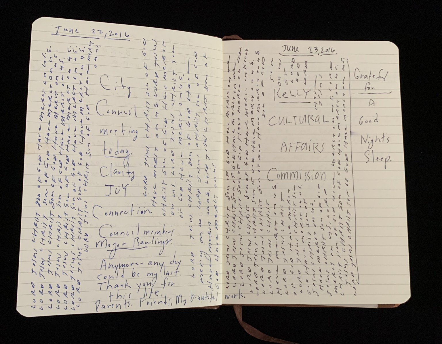 - Mantram pages; Beseeching the divine; Orlando shooting; Feeling abandoned; Distance from God; Moral high ground; American hypocrisy; Drone strikes; President Obama; Collateral damage; Piece 24 presentation; City of Dallas; Bryn the Corgi; Pet loss; Euthanizing dog; Grief; Presentation aftermath; Mass shooting; Public Art Committee; Approval of Piece 24; Quiet house; Hosting dinner; Kelly in Nebraska; Helping his Mom; Inner calling; Tanya Conovaloff surgery; Roxana health emergency; July remembrances; Barbara’s death; Mom’s birthday; Family picnics; Communion of grief; Police shooting; 29 Pieces messaging; Will to be better; Raw grief; One pure language; Hazrat Khan quote; Nice France violence; Baton Rouge killings; Mercy; History repeating; Pulitzer Centennial; War photographer questions