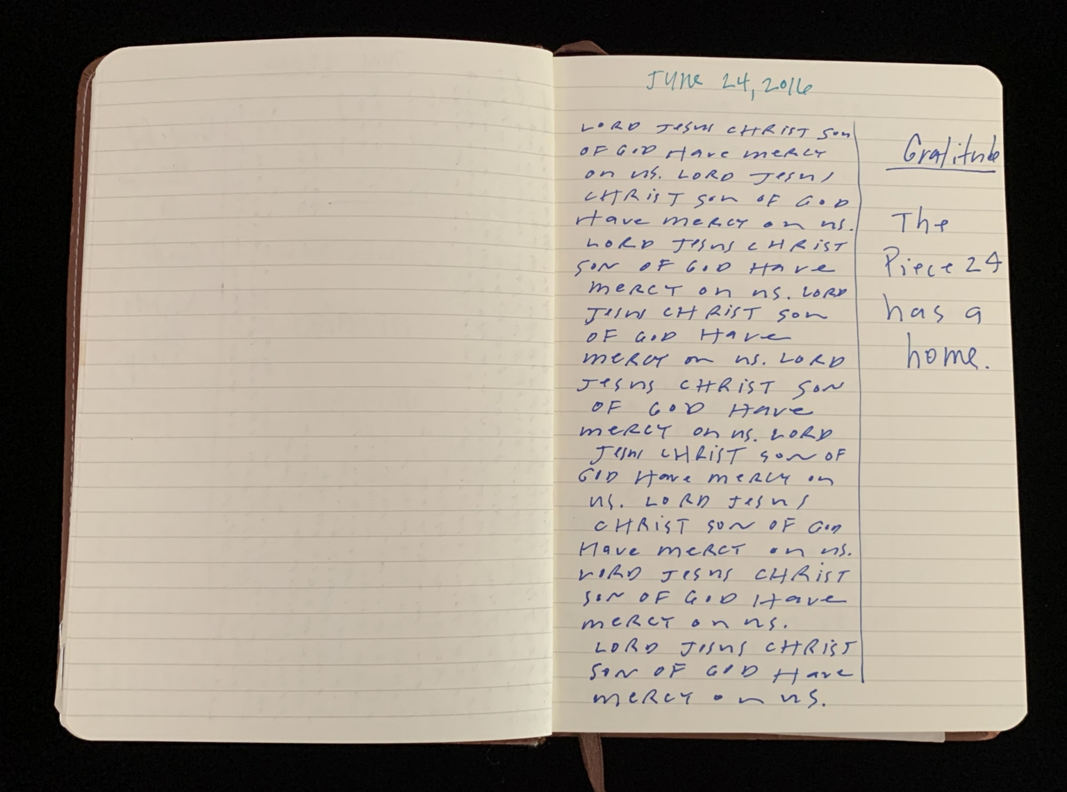 - Mantram pages; Beseeching the divine; Orlando shooting; Feeling abandoned; Distance from God; Moral high ground; American hypocrisy; Drone strikes; President Obama; Collateral damage; Piece 24 presentation; City of Dallas; Bryn the Corgi; Pet loss; Euthanizing dog; Grief; Presentation aftermath; Mass shooting; Public Art Committee; Approval of Piece 24; Quiet house; Hosting dinner; Kelly in Nebraska; Helping his Mom; Inner calling; Tanya Conovaloff surgery; Roxana health emergency; July remembrances; Barbara’s death; Mom’s birthday; Family picnics; Communion of grief; Police shooting; 29 Pieces messaging; Will to be better; Raw grief; One pure language; Hazrat Khan quote; Nice France violence; Baton Rouge killings; Mercy; History repeating; Pulitzer Centennial; War photographer questions