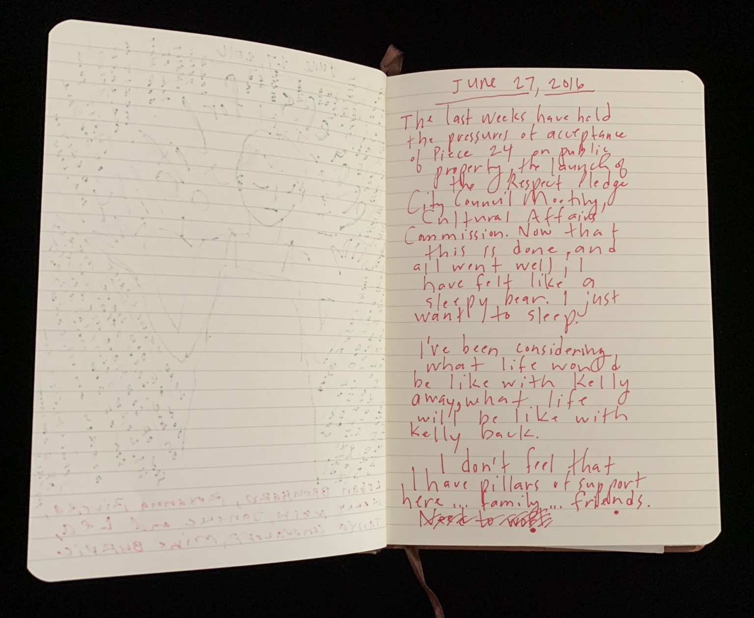 - Mantram pages; Beseeching the divine; Orlando shooting; Feeling abandoned; Distance from God; Moral high ground; American hypocrisy; Drone strikes; President Obama; Collateral damage; Piece 24 presentation; City of Dallas; Bryn the Corgi; Pet loss; Euthanizing dog; Grief; Presentation aftermath; Mass shooting; Public Art Committee; Approval of Piece 24; Quiet house; Hosting dinner; Kelly in Nebraska; Helping his Mom; Inner calling; Tanya Conovaloff surgery; Roxana health emergency; July remembrances; Barbara’s death; Mom’s birthday; Family picnics; Communion of grief; Police shooting; 29 Pieces messaging; Will to be better; Raw grief; One pure language; Hazrat Khan quote; Nice France violence; Baton Rouge killings; Mercy; History repeating; Pulitzer Centennial; War photographer questions