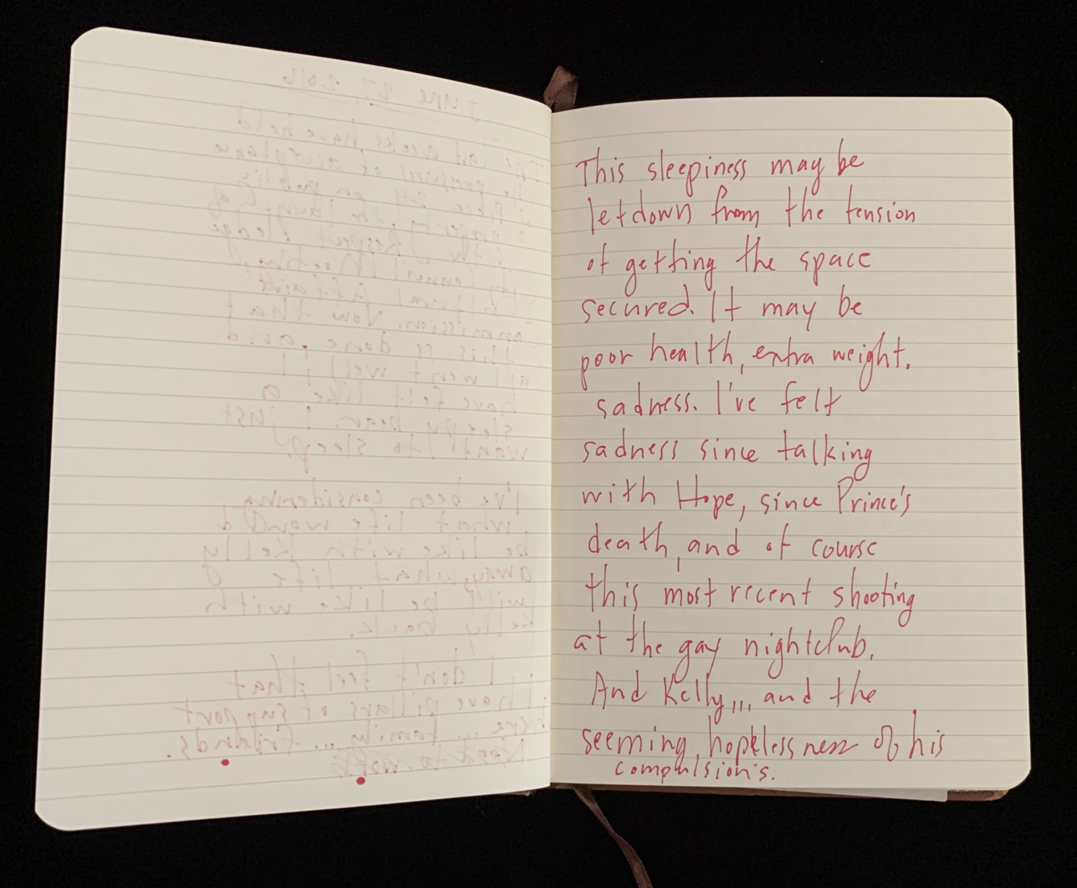 - Mantram pages; Beseeching the divine; Orlando shooting; Feeling abandoned; Distance from God; Moral high ground; American hypocrisy; Drone strikes; President Obama; Collateral damage; Piece 24 presentation; City of Dallas; Bryn the Corgi; Pet loss; Euthanizing dog; Grief; Presentation aftermath; Mass shooting; Public Art Committee; Approval of Piece 24; Quiet house; Hosting dinner; Kelly in Nebraska; Helping his Mom; Inner calling; Tanya Conovaloff surgery; Roxana health emergency; July remembrances; Barbara’s death; Mom’s birthday; Family picnics; Communion of grief; Police shooting; 29 Pieces messaging; Will to be better; Raw grief; One pure language; Hazrat Khan quote; Nice France violence; Baton Rouge killings; Mercy; History repeating; Pulitzer Centennial; War photographer questions